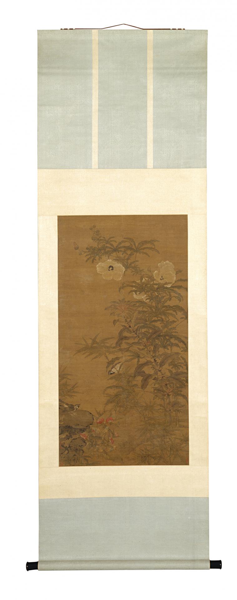 As a court official, Wang Xi had access to Song paintings in the imperial collections. Wang Xi’s approach to nature in the Gallery’s new scroll painting reflects the influence of Emperor Huizong. The birds and plants are portrayed with naturalistic details based on direct observation of the natural world. The images are carefully outlined with ink and shaded with naturalistic ink and colour pigments. There is also great precision in the artist’s approach to botanical details, which identify the semi-tropical plants as natives of southwestern China. The foliage of the plants creates a crowded and complex composition, thus mirroring the complexity of nature itself.
