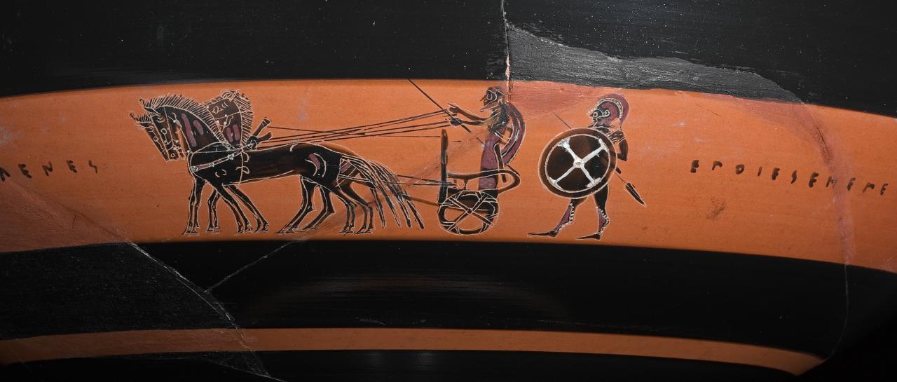 The scene on our vase, which was acquired in July 1980, through the Felton Bequest, at the sale of the Castle Ashby collection, seems to have been a great favourite with the painter, since he repeated it with minor variations on five other cups;14 ABV, p. 165. The other cups are Cambridge 63, Florence 70996, Munich 2332, Oxford 231, and Louvre C 10261. it shows a warrior approaching a four-horse chariot (Figs 4–5). He wears a low-crested helmet of Corinthian type and carries a round shield and a spear. On one side the shield has the device of a wheel in added white, on the other, a tripod. The charioteer wears a long tunic and holds the reins and a goad; behind his back is a shield with cut-away sides and a curved profile. Touches of red are used to emphasise details of the warrior’s armour, the charioteer’s drapery and shield, the horses’ necks and haunches, and added white for the shield blazons and other minor details.