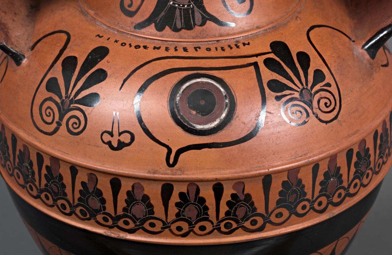 Our vase was potted by Nicosthenes; it was painted, like all the other Nicosthenic neck-amphorae that bear the signature of Nicosthenes, by an artist whom we call Painter N. He is the main black-figure artist in the workshop, and may be Nicosthenes himself, although at present the connection cannot be proven.