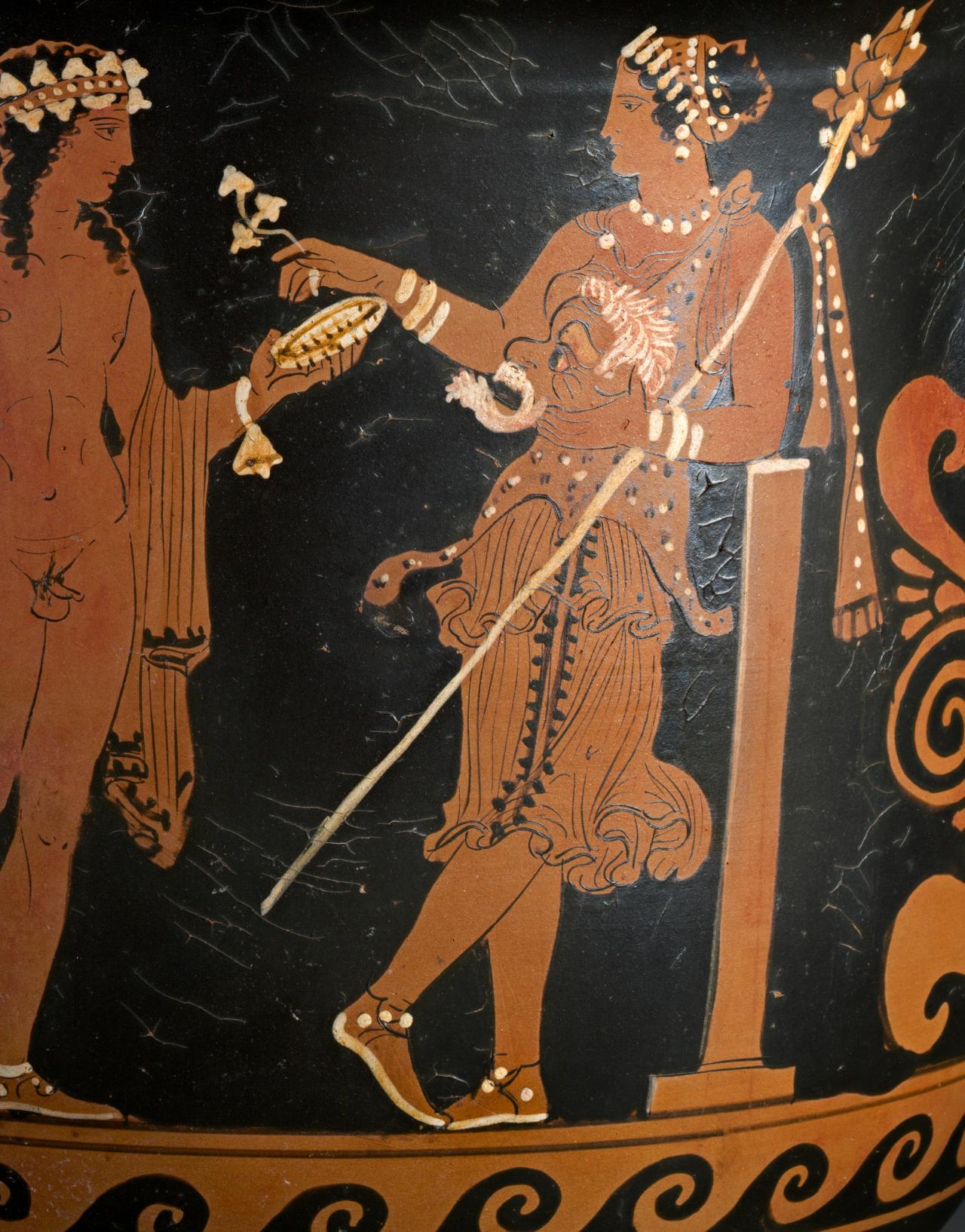The subject of the obverse (Figs 20, 26) is of special interest since it provides an excellent illustration of the connection between Dionysos, who was the god of drama as well as of wine, and the theatre. On the left stands the god, in youthful form, holding a thyrsus in his right hand and a phiale, shown in added white and yellow to simulate the metal of the original, in his left; a small bell, also in added white, hangs down from that wrist. Over both arms and behind his back is a piece of drapery, with the characteristic dot-stripe border; round his head is a dotted fillet with white ivy-leaves in front and white ribbons on the ends. In front of him stands a maenad, her left leg crossed in front of the right, in a relaxed pose, resting her left arm on a tall square pillar with a white outer edge. She wears a peplos, fastened on the right shoulder by a white brooch; it reaches to her knees, and has an overfall below the waist. Down the middle runs a double dot-stripe. Over this garment she wears a fawn-skin dappled with black and white dots. Her hair is bound up in a beaded sphendone, with a radiate diadem above the brow; she has bracelets on both arms, and wears slippers, enlivened by white dots. In her extended right hand she holds a small spray of white-leafed ivy; between her left arm and her body rests a white-stemmed thyrsus, like that of Dionysos, but with a white-dotted fillet tied just below the head. In her left hand she holds a white-haired phlyax mask.
