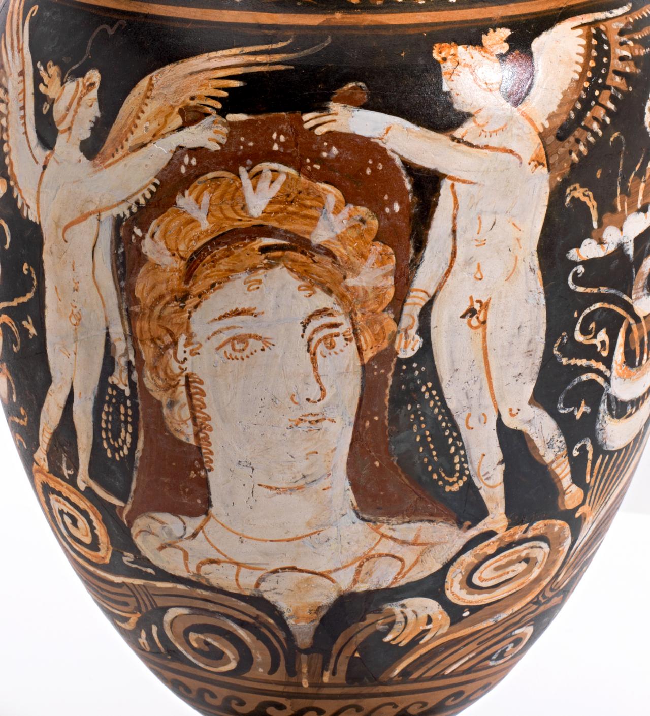In 1979 the Gallery acquired, again through the Felton Bequest, a remarkable Late Apulian oenochoe (Figs 29, 31) from the workshop of the White Saccos Painter,59 Accession no. D28/1979; Felton Bequest. Ht to top of handle 46, to edge of mouth 37.2, to top of figured scene 26.8; max. width 18. The White Saccos Painter is dealt with in detail in RVAp II, ch. 29. representing two Erotes adjusting a crimson veil on the head of Aphrodite, which rises from a flower in an elaborate floral setting. The central scene (Fig. 29) is rendered in added colours – mainly white, red and shades of orange, as on vases of the so-called Gnathia style (cf. the Melbourne squat lekythos, D17/1972) – but most of the subsidiary decoration is in the red-figure technique.