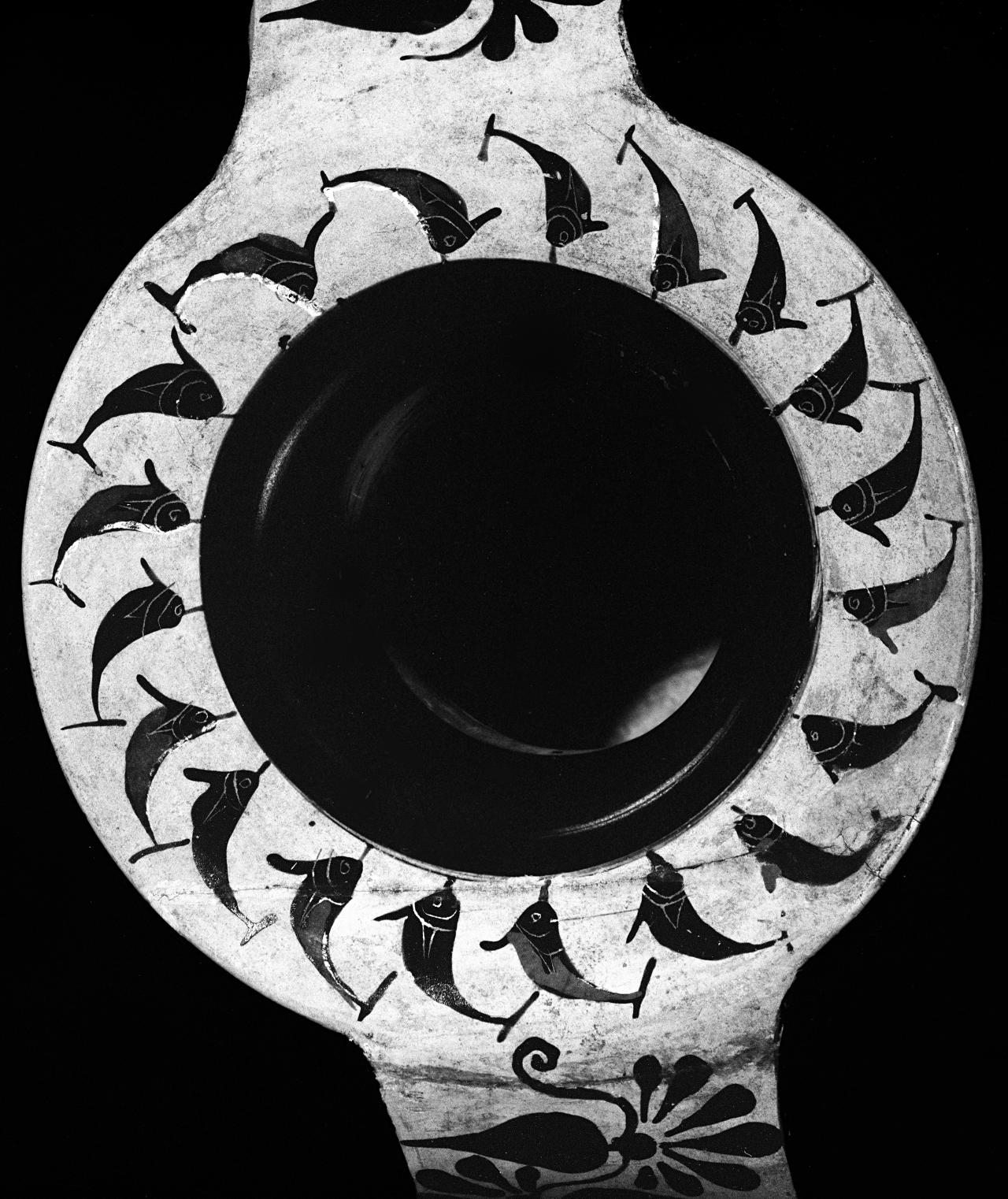 The flat rim of our vase is decorated with nineteen small dolphins (Fig. 9), and every second dolphin had a white belly and a red body, though the added colour has faded in many places.20 ‘Most have red on their bodies and a white belly line, but some are all black and one has only the white belly line’, CVA, p. 11, repeated in the Sale Catalogue, p. 130. This description is not quite correct; a careful study will show the original arrangement. Although some form of floral is perhaps more common in this position, there are other vases with dolphins. Similar zones of dolphins occur in East Greek pottery, and their presence on these Athenian neck-amphorae may be taken as one element of the Ionian influence on Attic art during the third quarter of the 6th century.21 See D. A. Jackson, op. cit.. p. 70. The influence is no less visible in sculpture. The third quarter of the 6th century was the heyday of the rule of Peisistratos, who seems to have encouraged Ionian craftsmen to work in Athens.