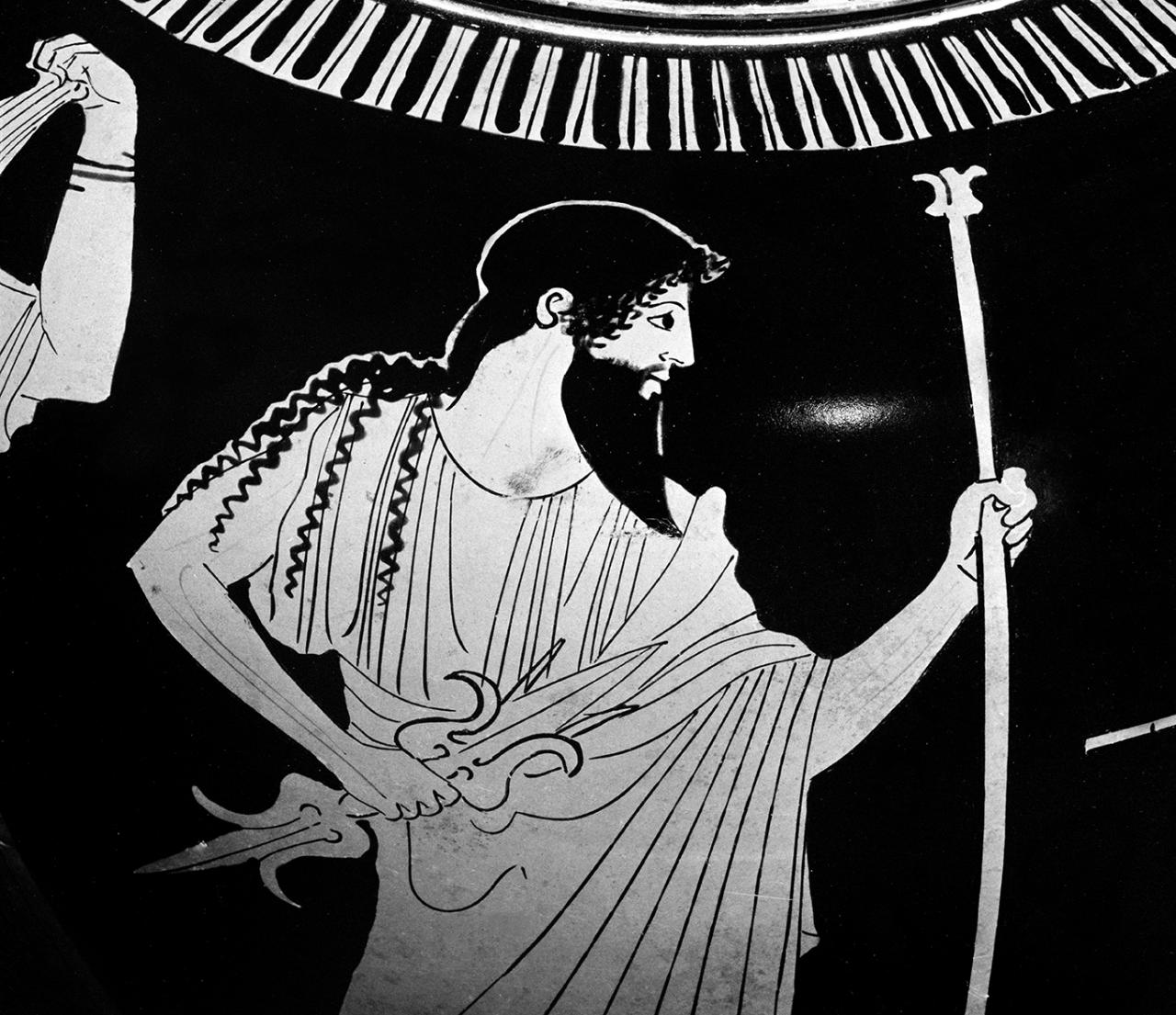 This picture is full of action; that on the back of the vase is quieter (Fig. 12), but no less dramatic. We enter the world of the Olympian gods. The majestic, bearded figure on the left, in chiton and himation, is Zeus, ‘lord of men and gods’, as Homer calls him (see detail, Fig. 17). He is easily recognisable by his sceptre (pointed end, lotus finial) and thunderbolt. Beside him is Hermes, also bearded. He is dressed as a traveller: short tunic, short cloak fastened on the right shoulder (chlamys), broad- brimmed hat (petasos), and winged boots. He holds his characteristic serpent-tipped staff (kerykeion) and in his right hand another object, a balance. The two pans are reserved in the clay ground, but the three cords attaching each pan to the horizontal bar are only incised in the glaze. The right-hand pan has sunk. The balance gives us the clue to the scene: it is the weighing of the souls (psychostasia) of the fighting warriors. Usually two small images (warriors or winged figures) are shown in the pans of the scale (cf. Fig. 19), but on our vase they do not appear. Here the fate of the warriors has been decided, and Hermes looks across at Zeus who turns to depart. The third figure, a goddess holding a sceptre in her left hand, looks at the balance and raises her right arm, fingers outstretched, in excitement.