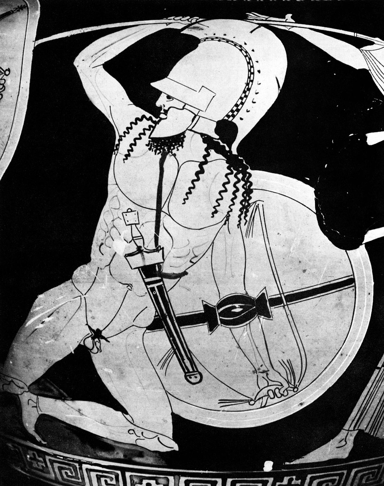 40 See R. M. Cook, CVA, British Museum 8, p. 54 on pl. 5; P. E. Corbett, The British Museum Quarterly 24, 1961. pp. 97–98; E. Knauer, Ein Skyphos des Triptolemosmalers, Berlin, 1973, p. 9, and p. 22, note 24. The shield-apron is first seen in East Greek art about 550 B.C. and appears in Attic vase-painting from the end of the 6th century until about 430 B.C.