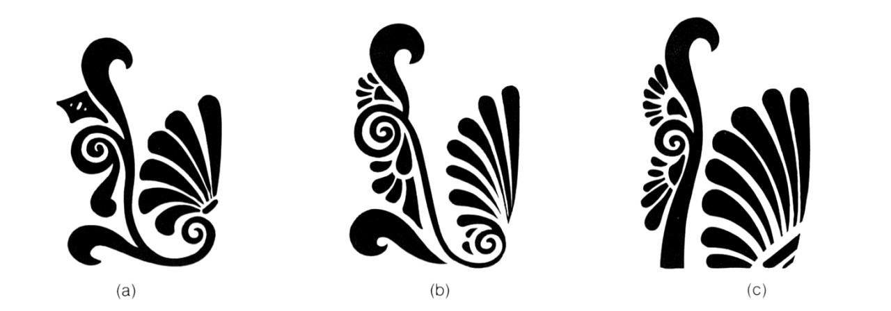 49 The different stages in the development of the framing palmettes are illustrated in PP, p. 10, fig. 2 (see fig. 19 here). Good examples of the first stage may be seen on the bell-kraters S. Agata 66 (LCS, p. 206, no. 45), Louvre Κ 240 (PP, fig. 14) and Louvre Κ 241 (LCS, p. 206, no. 44), where the affinities with Sicilian and with Early Campanian (e.g. Naples 2074 and 2097 = LCS, p. 206, nos 41–42) are especially close. The second stage (joined side-scrolls, with fans) appears on the bell-krater once on the Los Angeles market (Summa Galleries, inv. 82; Cat. I, no. 38 = figs 22–23), and on B.M. F 88 (PP, no. 36, pl. 10a, where attributed to Asteas). A variation on this type of frame, but again illustrating the process of separation from the handle palmettes, will be found on Basel Z 313 (PAdd, no. A 11, pl. 2a-b), Madrid 11037 (PPSupp, no. 66, pl. 6c), and the phlyax vase in Salerno (PAdd, no. A7; P. C. Sestieri, Arch. Class., 12, 1960, pls 40–42; Ill. Gr. Drama, IV, 31; PhV2, no. 58, pl. 3b; here fig. 21).