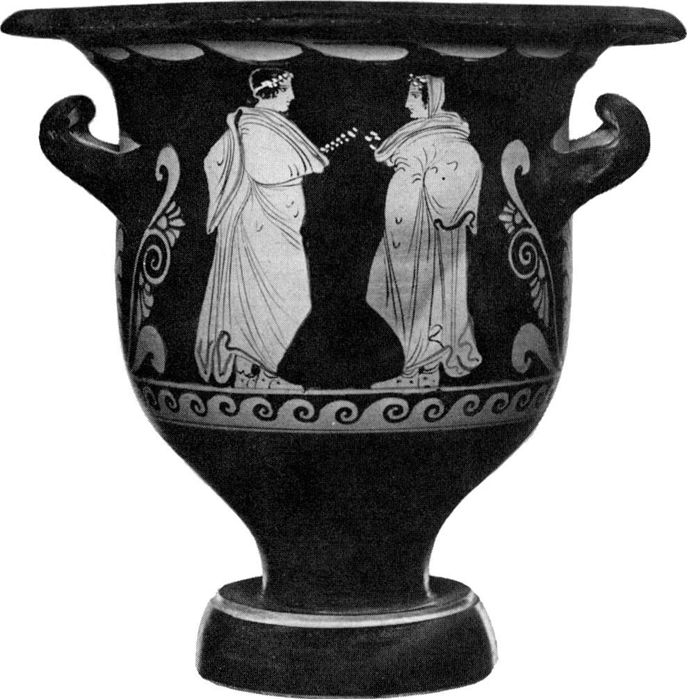 47 Accession no. D391/1980. Felton Bequest. Ht 35.5, diam. of mouth 34.7, of foot 16.6. A history of Paestan vase-painting is given in A. D. Trendall, Paestan Pottery, BSR, 1936, with supplements and addenda in BSR, 20, 1952, pp. 1–53 and 27, 1959, pp. 1–37 (= PP, PPSupp, and PAdd); see also Pestani, Vasi, in Enc. Arte Antica (pp. 90–94, with bibliography). Recent discoveries both in Sicily and at Paestum itself have made the existing publications somewhat out of date and a revised edition of PP is in preparation. The relations between Early Paestan and Sicilian are touched upon in LCS, pp. 194 ff„ and briefly in an article in Quaderni Ticinesi, 9, 1980, pp. 111–13, where the Melbourne vase is listed.