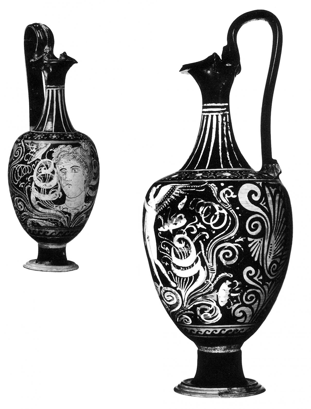 The vase itself, which is an oenochoe of the type usually referred to as ‘shape 1’, has an ovoid body, a long neck and a high handle; it is comparatively well preserved, with a few traces of retouching on the central figures. The shape has a fairly long history in Greek vase-painting; it appears in Athens from the end of the 6th century B.C. onwards, with a number of variations in the treatment of mouth, neck, body and foot as the red-figured style develops;60 See J. R. Green in Arch. Anz. 1978, pp. 262–72, and, for Apulia in particular, G. Sena Chiesa in Archaeologica: Studi in onore di Aldo Neppi Modona, Florence, 1975, pp. 423 ff. in South Italy oenochoai of shape 1 are comparatively rare except in Apulia where, from the middle of the 4th century onwards, they become increasingly popular, especially in the workshop of the Baltimore Painter, of which the White Saccos Painter and the other artists of that group must have been members. Most of these oenochoai have been found at or near Canosa, where in all probability the workshop was located. There is a wealth of evidence from the vase-paintings themselves to show that oenochoai of shape 1 were regularly used for the pouring of libations, especially to Dionysos, to a departing warrior, or at the tomb of the deceased.61 Good illustrations of its use may be seen on RVAp I, pls 111,4, 114,1, 120,5, 139,3, and, for funerary purposes, in H. Lohmann, Grabmaeler, Berlin, 1979, pls 9,2, 33,1, 51,3, or actually within the naiskos on pls 26,2, 29,2, 39. The earlier Apulian examples, which come from around the middle of the 4th century, have proportions midway between those of their Attic prototypes and of Late Apulian where, as with the Melbourne vase, the neck is taller and more slender and the body tends to become a little narrower.