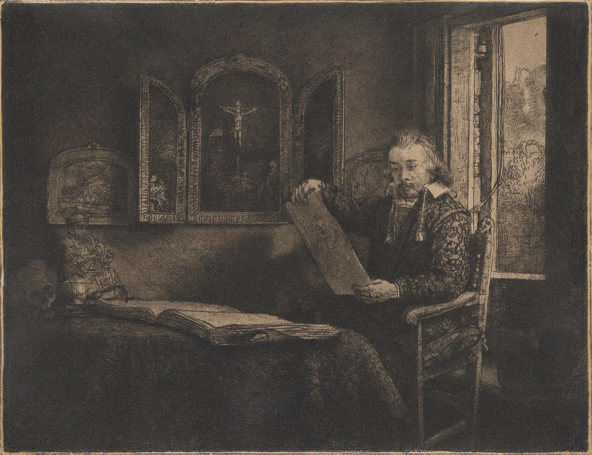 In this portrait, Rembrandt depicts his friend Abraham Francen as a passionate collector surrounded by his treasured objects, including an exotic carpet draped over a table, a Chinese sculpture and skull, and paintings on the wall. Rembrandt and Francen shared a passion for artefacts from South-East Asia, and both were avid print collectors. Francen is seen here in the act of inspecting a print, illuminated by light filtering through the window. In the great majority of impressions of this etching, the sheet of paper in his hands is black, but in this fine early impression, the paper is translucent and we can see that the image is a portrait of a man. Looking closely at Rembrandt’s print, we find ourselves engaged in the same activity that Francen is absorbed in.