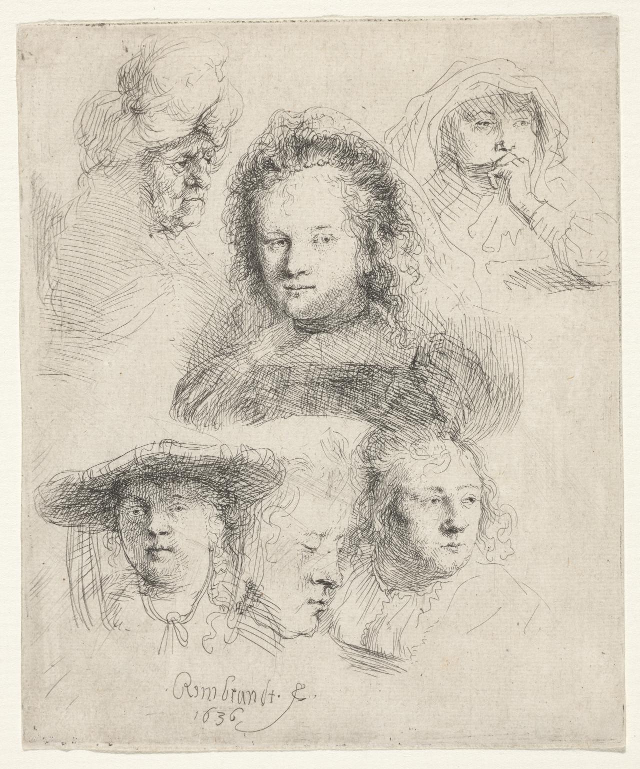 In contrast to this detailed, finely worked image, the early print Studies of the head of Saskia and others is an exercise in spontaneity. The etching depicts Rembrandt’s young wife, Saskia, in the centre of the image, surrounded by sketches of five other heads in various stages of completion. The variety of headdresses, and the different angles from which the heads are depicted, suggest that these were studies for figures in genre pictures or biblical narratives. Rembrandt made several etchings that imitate ‘study sheets’ throughout his forty-year career. He did not sell his drawings, but produced prints that looked like sketches, knowing that these would appeal to collectors who admired Rembrandt’s ability to capture the essential features of a face in a few lines.