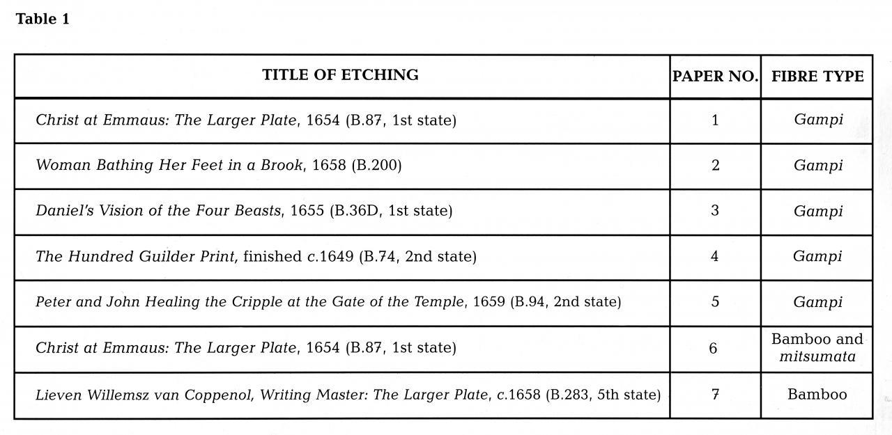 11 The only mention of fibre analysis found by the author to date in the literature published since Biörklund reported on his findings in 1968 appears to be that undertaken in the Asiatic Department of the Museum of Fine Arts, Boston, in 1970, but complete details have not been published; the conclusions drawn on the basis of this latter analysis appear to be similar to Biörklund’s (see S. W. Reed, ‘Types of Paper Used by Rembrandt’, in Rembrandt: Experimental Etcher (exh. cat.), Museum of Fine Arts, Boston, 1969, pp. 178–83).