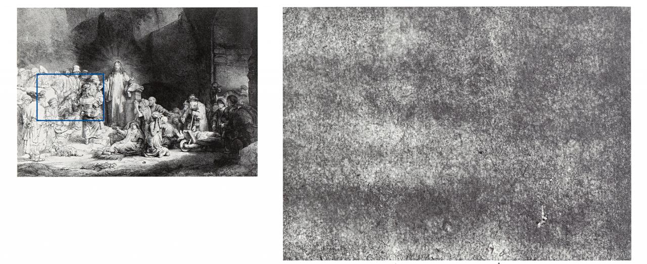 The aim of this study has been to gather objective information on the oriental papers used by Rembrandt for printmaking, of which there are seven examples in the collection of the National Gallery of Victoria. The research was also extended to a posthumous impression of a Rembrandt print, reworked by William Baillie, and to a print after Rembrandt, by James Bretherton, on oriental paper. The investigation of all nine papers included careful visual examination, ß-radiography22 The ß-radiography process involves placing the paper between a poly[Carbon 14] methylmethacrylate plate and a sheet of Kodak Biomax MR film. A 1:1 black and white photographic contact print can then be made. ß-radiographs are useful because they reveal details about the paper structure, including fibre distribution and quality, and any characteristics imparted by the mould upon which the sheet was formed. Thin areas appear lighter on a ß-radiography. and fibre analysis.