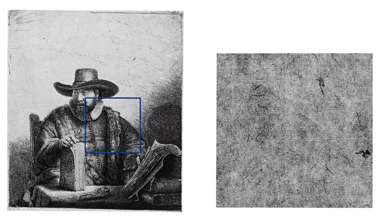Paper A, which bears an impression of the Rembrandt etching Cornelis Claesz Anslo, Mennonite Preacher, 1641 (B.271, 2nd state), reworked by the Irish printmaker and dealer Captain William Baillie (1723–1810), illustrates the degree to which oriental papers could be imitated in Europe by the late eighteenth century. Hinterding notes that Baillie refers to such ‘oriental’ papers as ‘Indian paper’ or as ‘the finest Japan paper’, in his own catalogue, The Works of Captain William Burnie, of 1792.39 Hinterding, p. 272. The ß-radiograph of Paper A shows that it convincingly replicates the features of a Chinese paper, but as Biörklund revealed in 1968 the imitation oriental papers do not contain any oriental fibres at all.40 Biörklund, ‘Paper Analysis’, p. 175. Fibre analysis of Paper A shows it to be made of cotton.