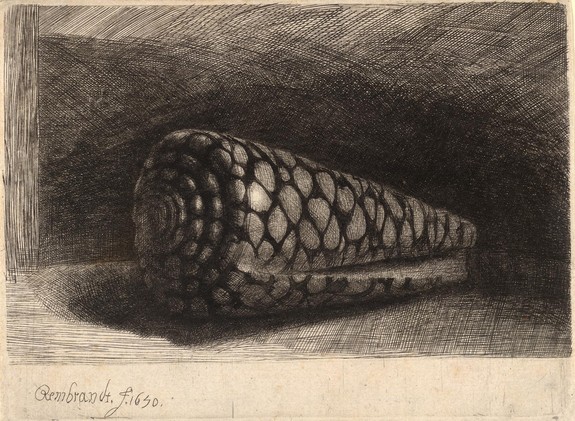 The conus marmoreus varies in size from 2½ ins. to 6 ins. The etched shape is 2½ ins. long and thus presumably the exact size of the model from which Rembrandt worked.2It has been pointed out by P. E. Schwerin, Australian Shell News No. 4, 31st Oct. 1973 that Rembrandt omitted to draw the shell in its mirror image on the plate. As a result it appears in the print as a sinistral shell while it should be a dextral shell. The same fact is referred to by S. P. Dane, Shell Collecting, London 1969, p. 35. I owe these references to the kindness of Dr B. J. Smith, Natural History Museum, Melbourne. It is of Indian-Pacific origin and may well have formed part of a large collection of shells listed in the inventory of Rembrandt’s house which was drawn up in 1656.3Dr C. Hofstede de Groot, Die Urkunden über Rembrandt, The Hague, 1906, p. 199, No. 179 ‘op de Agterste Richel’. Like the gentleman-virtuosi of the 16th and 17th centuries Rembrandt had brought together over many years a universal collection, consisting of objects of art, of nature and of antiquities.4W. Scheller, Rembrandt en de encyclopedische Verzameling, in Oud Holland, 1969 2–3, p. 81 seq. The portrayal of the conus marmoreus gives us an insight into one of the ways in which his collection served him.