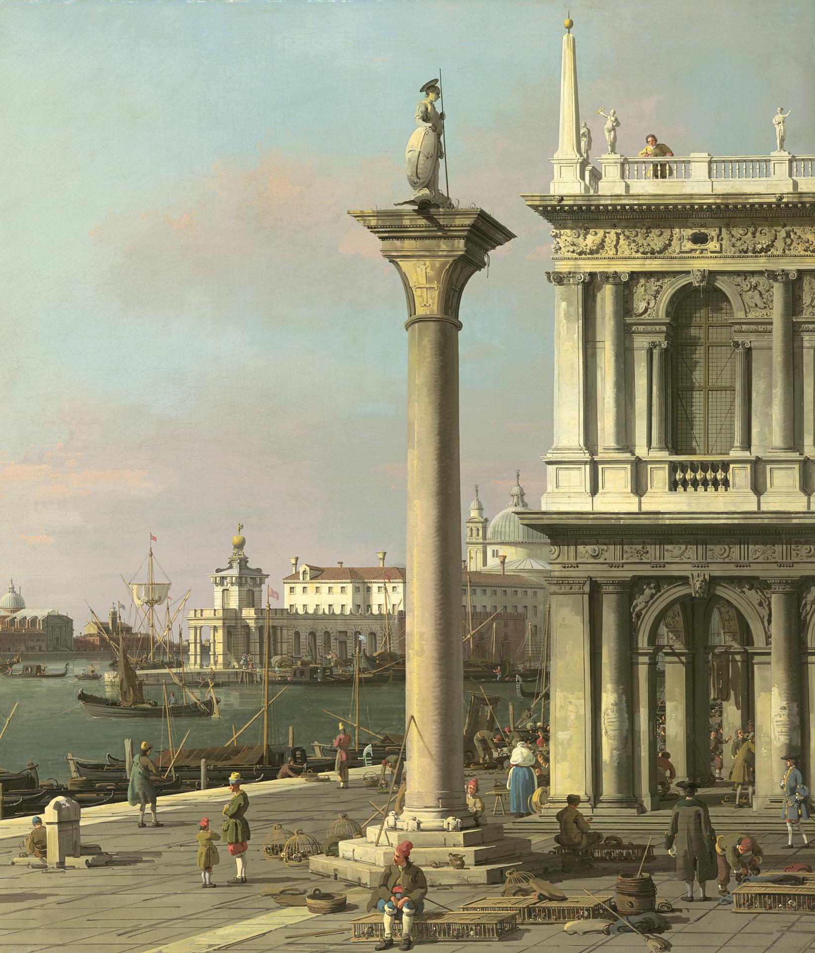 When these are compared to the photograph published by Devapriam, we see an interesting sequence that runs from the photograph, which is confused compositionally, to the Bellotto, where the insistent recession generated by having two matching columns in recession is only partially tempered by the anchoring of the nearer column to the top of the canvas, and from there to the Melbourne painting, where the second column is done away with and the Column of St Theodore is brought down to the height of the Libreria and thickened. This results in a more stable and harmonious composition of overlapping rectangles of the Libreria and column, the sky and the ground plane. The receding line of the white edge of the quay is now comfortably contained within these rectangles, to the extent that it could be reinforced by a further band of white paving in the foreground. The whole is enlivened by the cool greens and pink and grey clouds of Canaletto’s late style, and by the occasional excursion into painterly abstraction in such passages as the worn posters on the columns of the Libreria and the sails of the boats. This has been achieved, of course, at the expense of the true, measured relationships between things, be they figures or architecture, in complete contradiction of what made linear perspective so important to the quattrocento, but that is Canaletto’s way and the way of eighteenth-century scenographic view-painters generally.