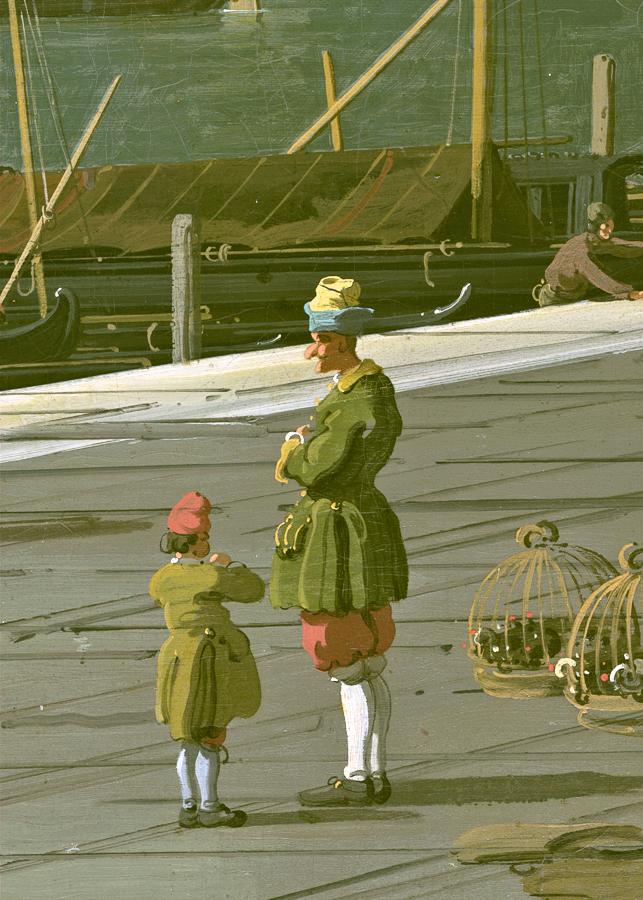 One detail of Bacino di S. Marco that calls for further investigation is the figure of the man with a boy (fig. 9). Canaletto’s figures are to some extent formulaic, but this figure is distinctive and corresponds exactly to one of the figures in a drawing A crowd of spectators watching an acrobat (fig 10).48 See Constable & Links, no. 840****, vol. 2, pp. 616–17, and vol. 1, plate 222; then private collection, Switzerland. L. Dania, ‘Un Disegno inedito di Antonio Canaletto’, Notizie da Palazzo Albani, vol. 1, nos 1–3, 1972, pp. 52–6; M. Natale, ‘Peintures et dessins venitiens’ in Peintures et dessins venitiens (exh. cat.), Electa, Milan, 1978, pp. 85–246, see p. 183; Brussels, Petals des Beaux-Arts, Masterpieces of Eighteenth-Century Venetian Drawing (exh. cat.), 1983, p. 154, no. 104; Kowalczky in Kowalczyk & da Cortá Fumei, 2001, p. 12, note 4 (as Bellotto). Sold Christie’s, London, 4 July 2000, lot 46, bought Jean-Luc Baroni, in the Colnaghi Summer 2001 drawings catalogue (An Exhibition Of Master Drawings, Colnaghi at Adam Williams Fine Art Ltd), New York, 2–26 May 2001, and at Colnaghi, London, 13 June–20 July 2001, no. 24, illustrated in colour, as Canaletto. I would Like to thank Jean-Luc Baroni for providing a photograph. This drawing is one of several that may have come from the same sketchbook, identifiable by the numbers they bear.49 See Constable & Links, under no. 840****. They identify several drawings originating from more than one sketchbook that were apparently bound together at some point, as indicated by numbers such as ’56’ or ’59 uolta’ (i.e. 59 verso). Three of these drawings, 840*, 840** (The six figures and bird-coops) and 840***, numbered respectively 43, 42 and 49, they argue came from the same sketchbook. These three they label as ‘attributed to Canaletto’, although the Crowd watching a tumbler (840 ****), which is in the same style, is considered by them to be autograph. Indeed all the figure drawings that Constable & Links connect by way of these ascribed numbers seem to be stylistically similar, as was recognised by Bettagno, who ascribed the Crowd watching a tumbler to Canaletto without qualification. Another drawing of this group shows figures with birdcages like those at the base of the column in the painting, which was where the bird sellers gathered, although none of the figures correspond.50 Constable & Links, 1976, no. 840**, vol. 2, p. 615, vol. 1, plate 221 (as attributed to Canaletto).
