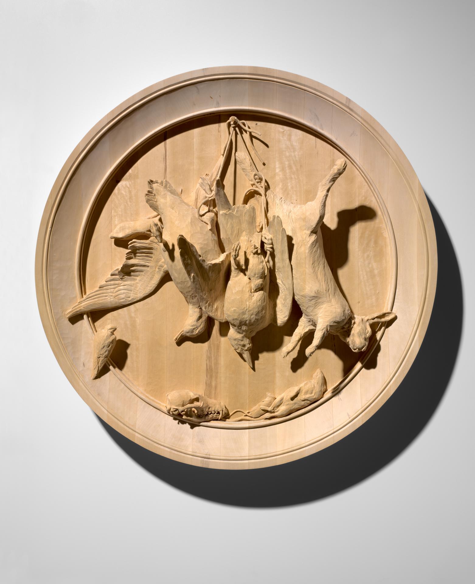 Meticulously hand-carved from jelutong, a pale-coloured hardwood that in recent years has become Swallow’s preferred material, Salad days is a relief sculpture in the classical tondo format. A rabbit, duck, magpie and sparrow form the central ensemble, tethered together, hanging upside down. Beneath them rats, mice, lizards and a small fox’s skull add to the inventory of deceased creatures. Rendered with remarkable exactitude and attention to detail, the bodies of these animals appear oddly alert, as if in suspended animation or between life and death, strangely fixed forever in their final moment. Looking in from an outer edge, a swallow has stopped to survey the sombre scene. Witness to time’s passing, the bird (and artist’s namesake) encapsulates the work’s reflection on mortality, and self-consciously dwells on the artist’s past.