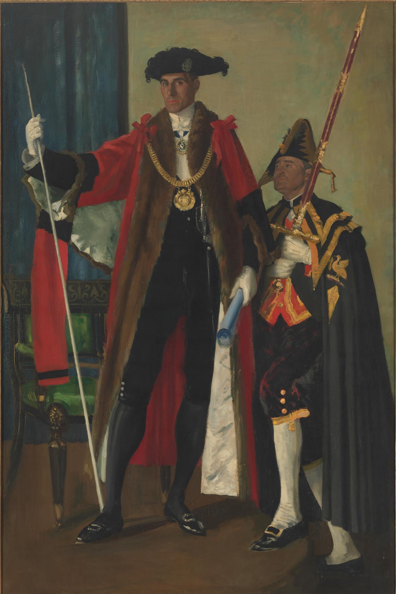 It was like this. When I was offered the usual 100 guineas presentation portrait I suggested that I should give the commission instead of leaving that (as had been usual) with the asinine chairman of the Walker Art Gallery [in Liverpool]; and John liked the idea of doing it. We went to the colour-man together and he wanted a vast canvas and I think had in mind a whole group of mace bearers, etc., but I persuaded him to moderate the size.4Harold Chaloner Dowdall, letter to Sir Sydney Cockerell, 6 June 1938, quoted in Leonard Cox, The National Gallery of Victoria 1861 to 1968: A Search for a Collection, National Gallery of Victoria, Melbourne, c. 1970, p. 155.