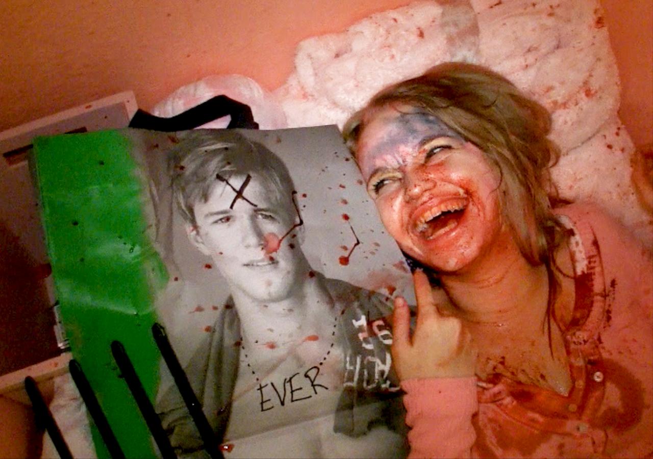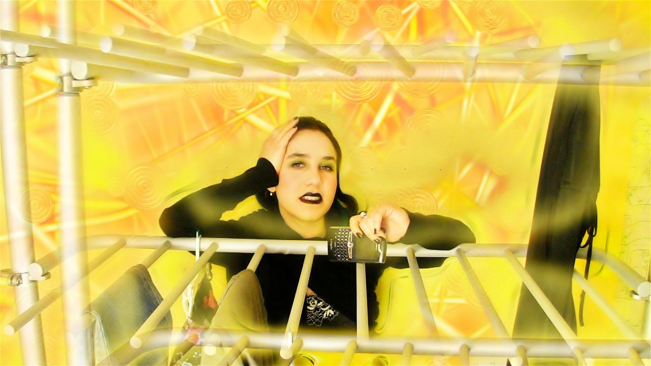 It is clear that Re’Search Wait’S does not depict but embodies this swarming order. Characters often seem lost, in a pubescent kind of way, hysterical through fear and loathing, love and longing. The anxiety of ‘work’ and ‘career’ looms large, but control over this aspect of their lives feels opaque, even for a character as narcissistic and power-hungry as Y-Ready (played wonderfully throughout by Veronica Gelbaum). ‘When I send you a winking emoticon, it doesn’t mean something fun, it means I’m hoping for a serious injury, followed by a mild Vicodin addiction, followed by a Vicodin withdrawal, followed by you getting me a latte’, Y-Ready spits in Temp Stop. Although she delivers this gem to the camera, it is unclear who exactly it is addressed to. Throughout the movies, characters carry mobile telephones but regularly talk directly to camera in a mode of address often found in vblogs or video selfies posted on social media; that is to say, directed to everyone, no-one and themselves at once. This leads to a hazy ontology of communication within the movies, and a confusion of the roles of performer, character and viewer.