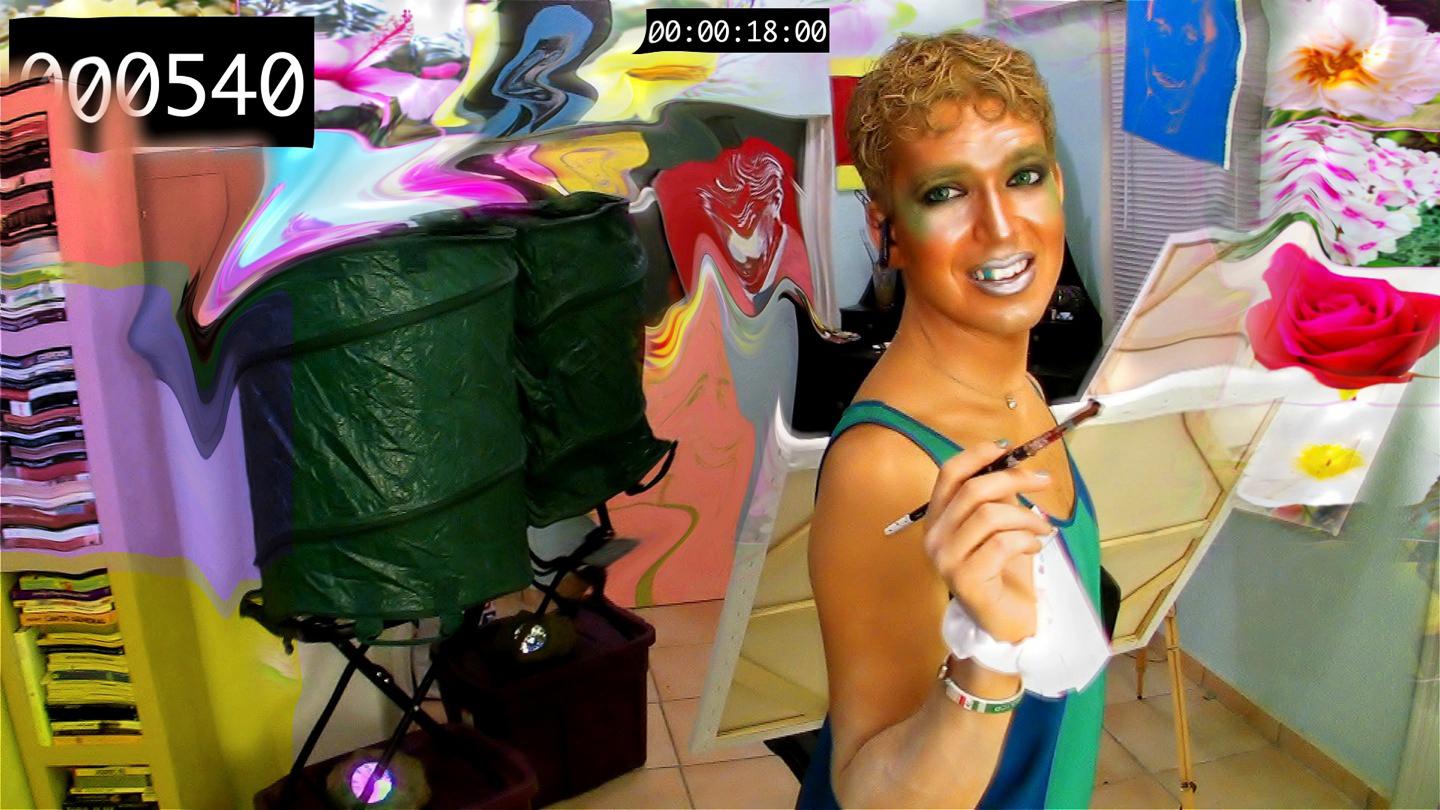 The characters played by Trecartin, in particular Wait and JJ (in their range of manifestations), undergo the greatest physical and linguistic transformations. We are introduced to Wait in the first scene of Ready, as he struggles with the after-effects of too many ‘conceptual drugs’ – products that involve adopting personalities wholesale. This constant state of becoming is, of course, exhausting (physically and metaphysically). When we meet JJ in Ready he has a radiant golden glow, vital as he paints his canvases. By the time we reach Roamie View : History Enhancement, however, JJ is a husk, totally spent, like an ecstasy user out of serotonin. He is desperate enough to hire Roamie (played by Alison Powell) to travel back in time to attempt to change the past and thus improve his future-present trajectory. This flight of fancy is important to locate, because at its heart this series is science fiction projecting a future constituted by the complex logic of the internet and our highly malleable subjectivities. This logic is not unordered, or even disordered, but contains simultaneous orders waxing and waning in influence.