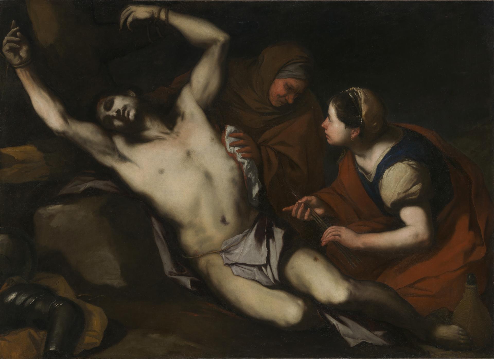 The dramatic lighting and taut compression of space employed here by Giordano are typical of the works he made during his early years in his native city, Naples. He adopted the dark and gritty realism of Caravaggio, who also worked there, as did the Spanish artist Jusepe de Ribera. The latter lived in Naples for over thirty years and became its leading artist, and Giordano trained under him for nine years. So closely did he follow his master, that this painting was once attributed to the Spaniard. Ribera also treated this subject at least twice, and these works directly inspired Giordano. In particular, they share the compositional device of Saint Sebastian’s arms being tied above his head around the column that supported him while being shot. Although he has collapsed on the ground, this elongates and accentuates the saint’s powerfully muscular body being bathed by the two women. Such treatments of this martyr led to overtly sexualised interpretations of this narrative, which also engendered homoerotic interpretations.