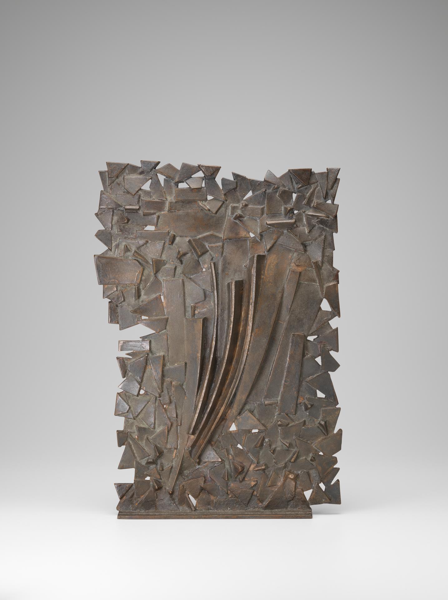 An internal energy animates the sculptures of postwar British artist Robert Adams, from his first carved wooden forms to the later abstract welded compositions for which he is best known. His career was at its highest point in 1961, when the artist was forty-three years old, the year he left his teaching job at London’s Central School of Art and Design to sculpt full-time. Screen form, 1961, which Adams made in that year, marks a departure for the artist towards sculptures that could be utilised in modern architectural spaces. A confetti of triangular metal fragments appears to cling, as if by magnetic attraction, to a cluster of curving, upwardly thrusting stalks, capturing dynamic movement within a flattened, static and nominally rectangular matrix. Defying gravity, a multitude of delicate shapes hovers in space, as insubstantial as paper clippings. From behind, light pierces the broken surface creating a twinkling effect of fragile impermanence, at odds with the immutable and weighty bronze and its darkened matte surface.1Nehama Hillman, Robert Adams, A Critical Study and Complete Catalogue. M. A. dissertation, Institute of Fine Arts, New York University, 1969 (copy in Tate Gallery Archive), p. 13, in Alistair Grieve, The Sculpture of Robert Adams, Henry Moore Foundation in Association with Lund Humphries, London, 1992, p. 76.
