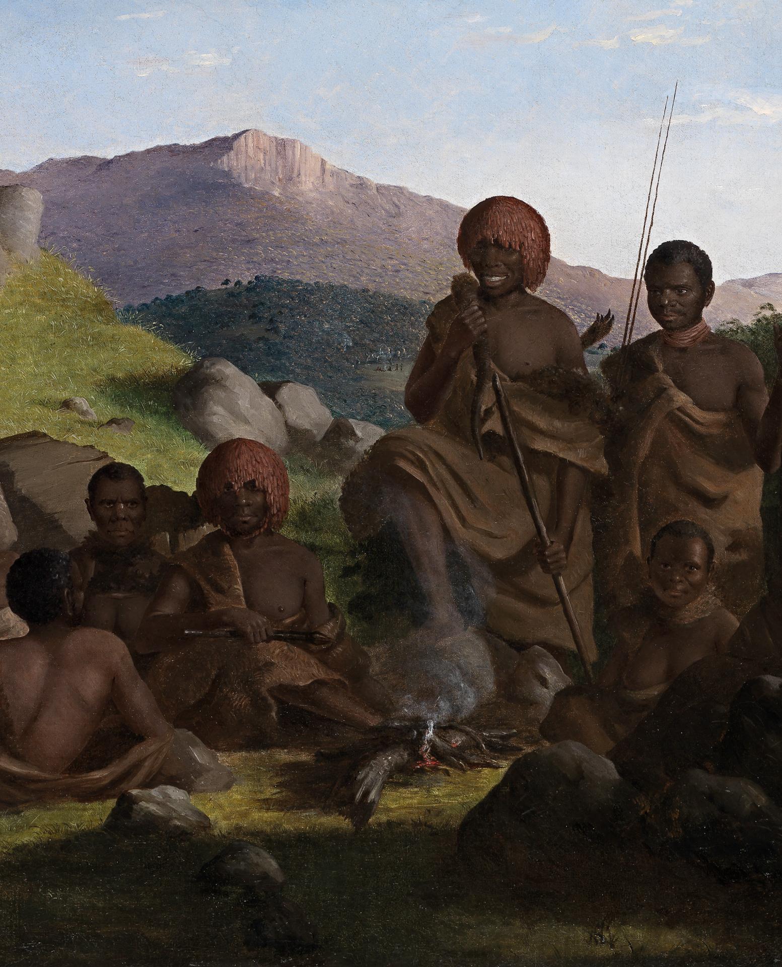 After a two-year residence in Victoria, Robert Dowling returned to Launceston four days before Christmas in 1856. Tasmanian Aborigines was then exhibited in March 1857 at the corner shop of Mr Tozer, a watchmaker in Launceston. Given the degree of revision and the complexity of its initial configuration, it seems certain that the picture was conceived and begun, if not completed, in Victoria. It is probably only there that Dowling first encountered Indigenous people, having the opportunity to meet and paint members of the Mopor people of Western Victoria who were employed on grazing properties owned by relations of the artist and other similarly benevolent associates.