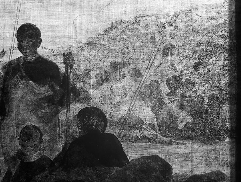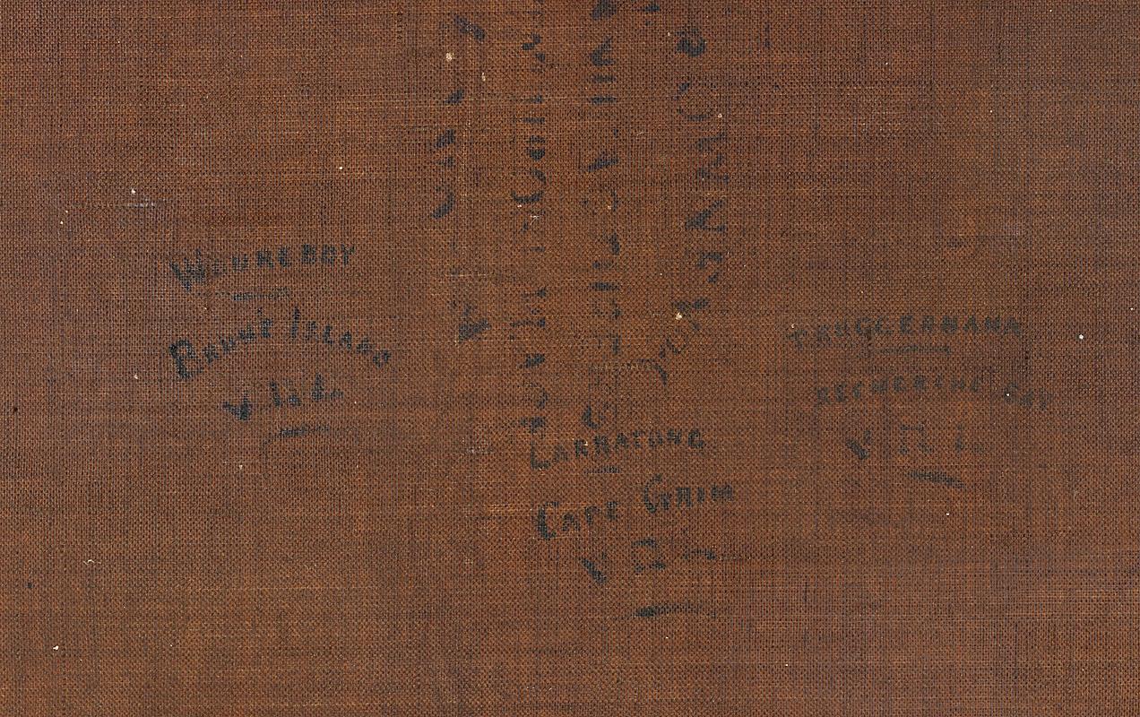 In preparing for the recent conservation treatment, an examination by transmitted infrared radiation revealed an all-but-forgotten feature of this work: when Dowling painted Tasmanian Aborigines, diligently drafting Bock’s head studies onto the bodies of his own composition, he also transcribed the identity and place of origin for each individual onto the back of his canvas. These vital inscriptions in black paint have been covered by the lining and are no longer accessible. The historical interest in deciphering the identity of individual Tasmanian Aboriginal people within the context of Dowling’s appropriation is perhaps more poignant to us now. So much so, that the need to retain a lining that conceals the artist’s inscriptions was reconsidered.