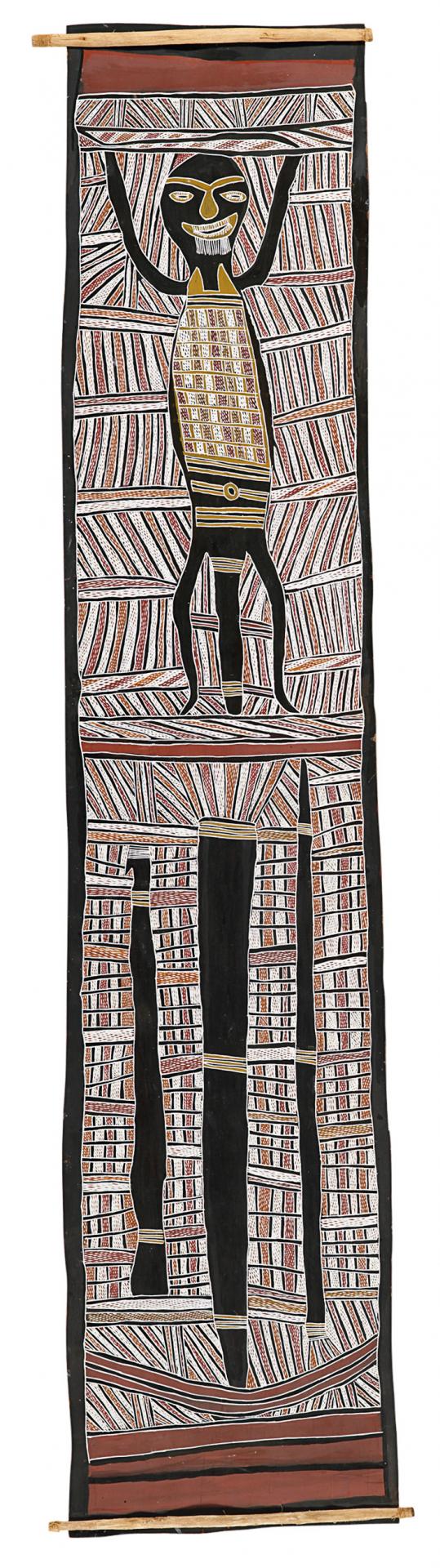 The origins of the collection lie in three works painted by Djutjadjutja Munuŋgurr (fig. 2), Gawirrin Gumana (fig. 3) and Dundiwuy Wanambi that were purchased by the Gallery and exhibited in its 1994 survey of contemporary Indigenous art, Power of the Land. While the Gallery acquired examples of rare, early works from Yirrkala, such as Djeriny’s Bol’ŋu, the Thunder Man, c.1952 (fig. 5), the Yirrkala region remained under-represented in the NGV collection. To redress this weakness and on the strength of the three initial paintings, Judith Ryan, Senior Curator of Indigenous Art, negotiated an unprecedented acquisition: a contemporary series that would span a breadth of Yolŋu artistic subjects and constitute a survey of painting from the area. The resulting paintings were submitted to the National Aboriginal & Torres Strait Islander Art Award in 1994, where Dundiwuy Wanambi’s Wuyal was selected as the prizewinning work in the bark painting division. It was subsequently acquired by the Museum & Art Gallery of the Northern Territory, bringing the final number in the suite to twenty-five. The NGV displayed these paintings in Miny’tji Buku Larrŋgay: Paintings from the East that opened the Gallery’s third Indigenous exhibition space at its St Kilda Road location in 1995. Gawirrin Gumana declared the exhibition space ŋärra, sacred ground, a state that reflected the power of the paintings’ ancestral designs.