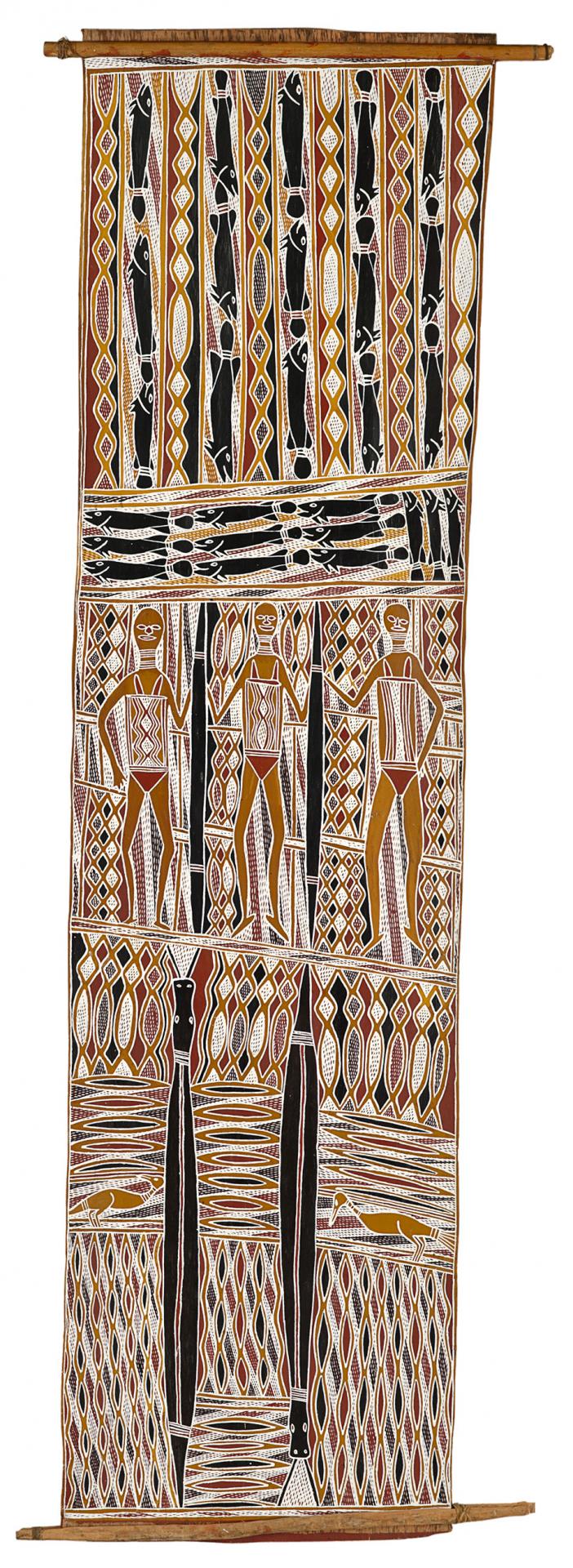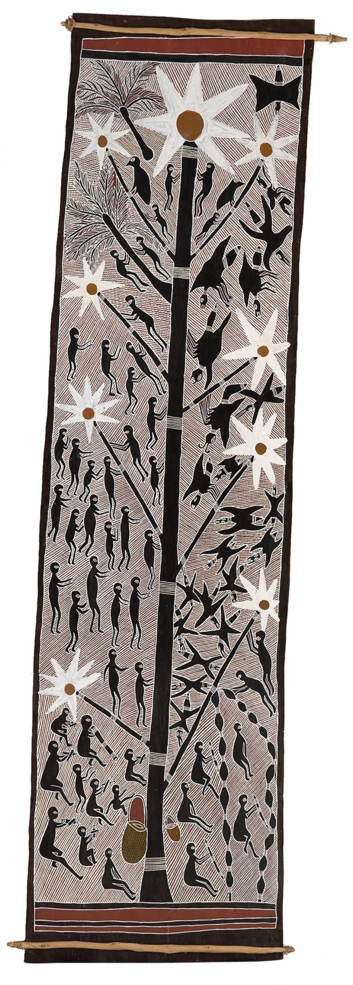 The Aboriginal community of Yirrkala in north-east Arnhem Land has produced some of the most masterful Australian painters of the mid- to late-twentieth century. Their barks are adorned with the unique designs of the region, comprising woven ochre cross-hatching and intricate geometric patterns interspersed with striking figurative motifs. The juxtaposition of pattern and icon structures the graphic lexicon of the classic Yolŋu aesthetic, producing paintings that may be read in a variety of ways. Like the representational traditions of history painting, layers of symbolism, allegory and moral instruction are captured within climactic moments drawn from the epic events of the ancestral past, producing religious masterpieces that have all but eclipsed their secular counterparts.1 While painting from the region is characterised by barks displaying sacred ancestral designs, Naminapu Maymuru White, Gulumbu Yunupiŋu, Wukun Wanambi, Wolpa Wanambi and Boliny Wanambi also paint in immediately recognisable secular styles based on intricately repeated icons: expanses of stars, schools of fish and swarms of bees and mosquitoes. These Yolŋu ‘history paintings’ convey the drama and power of the ancestral world and depict themes such as the fearsome Shark (Mäna) thrashing the water in anger, or the mighty Thunder Man (Bol’ŋu) poised in the act of casting thunder and lightning from the heavens. These paintings are described by Yolŋu as an ancestral legacy that details the indissoluble bonds between people and their heritage, bridging spiritual and material worlds.