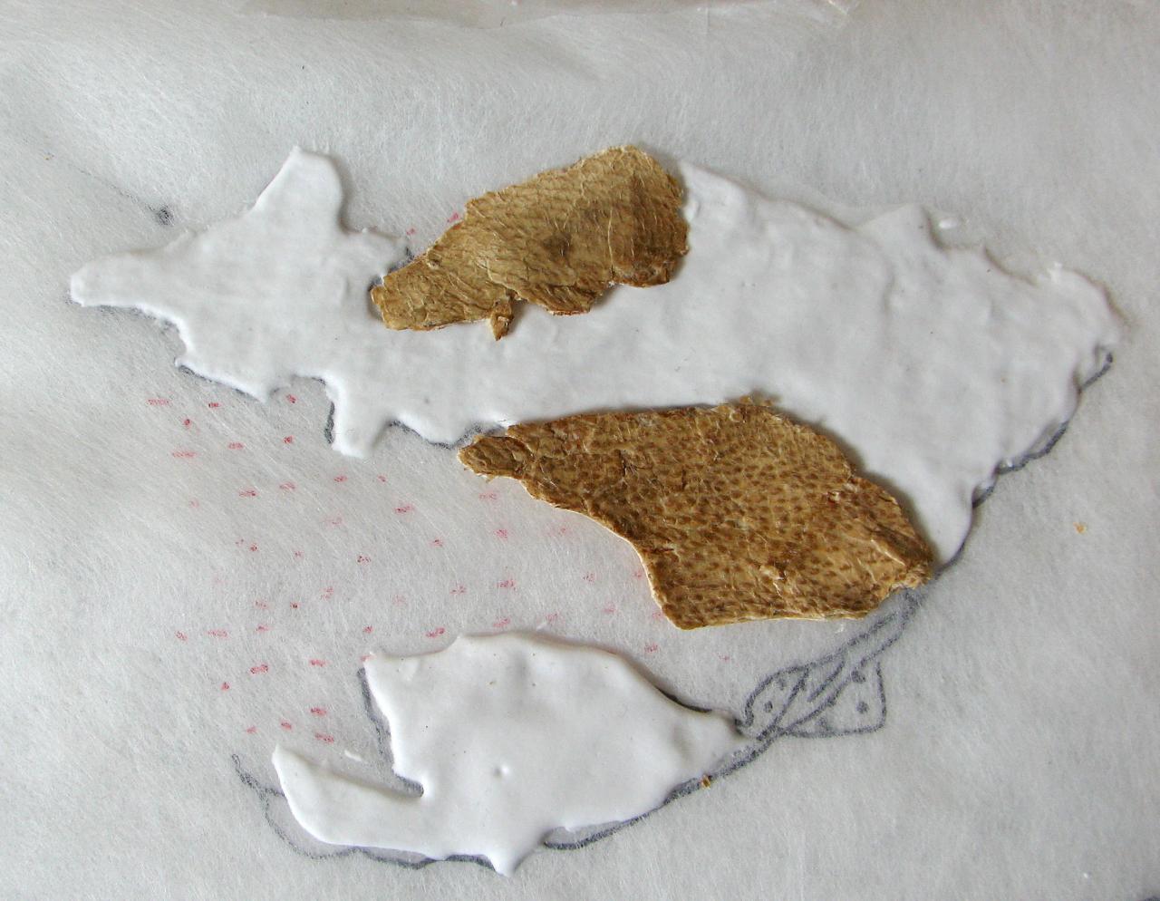 In areas of loss, a map of the position of the original pieces was made before removing the original pieces from the existing support materials. To make the fills blend in a custom made textured silicone stamp was used, made by taking an impression from the surface of the belly of the sheep using cling wrap as a barrier.