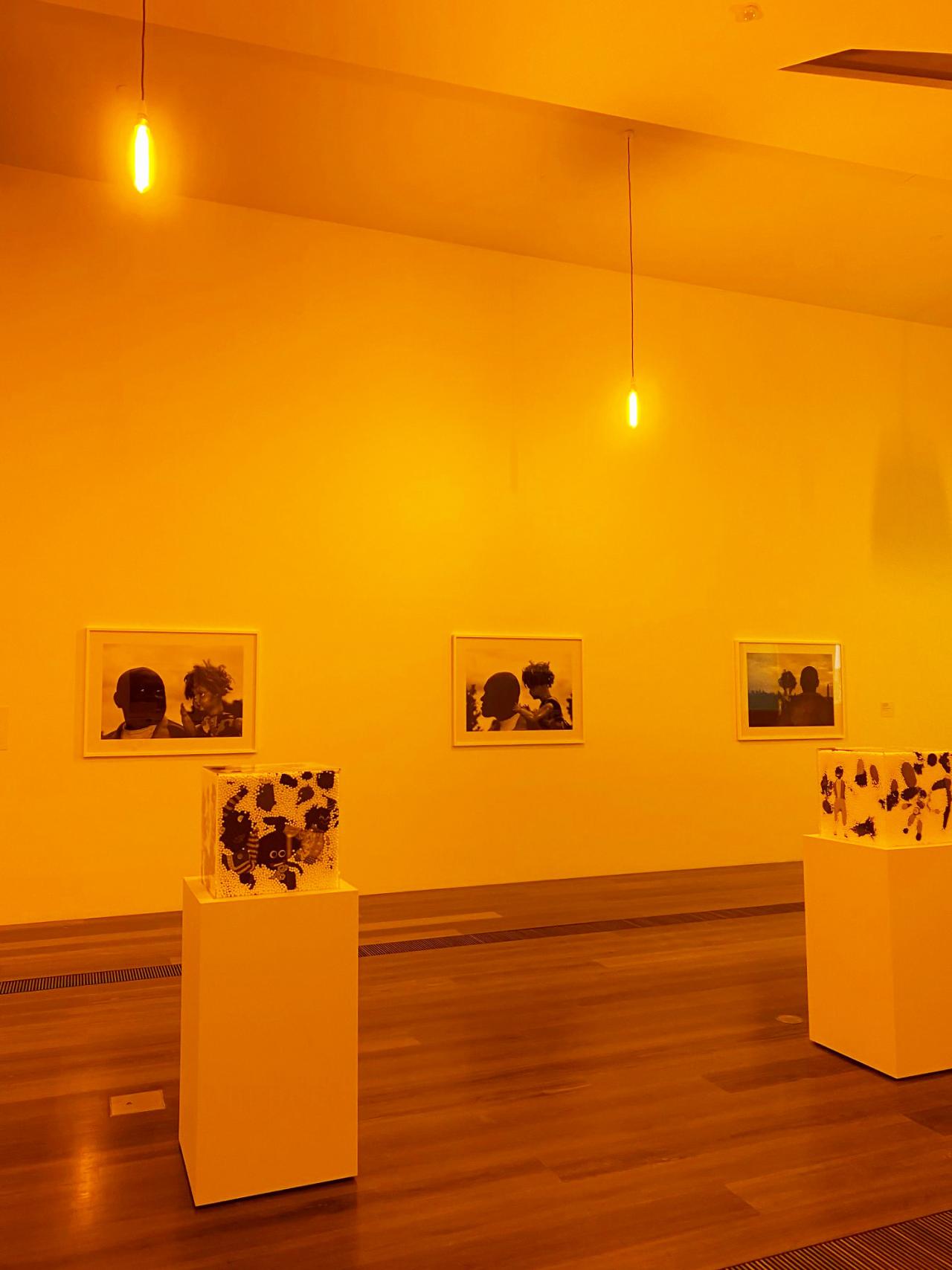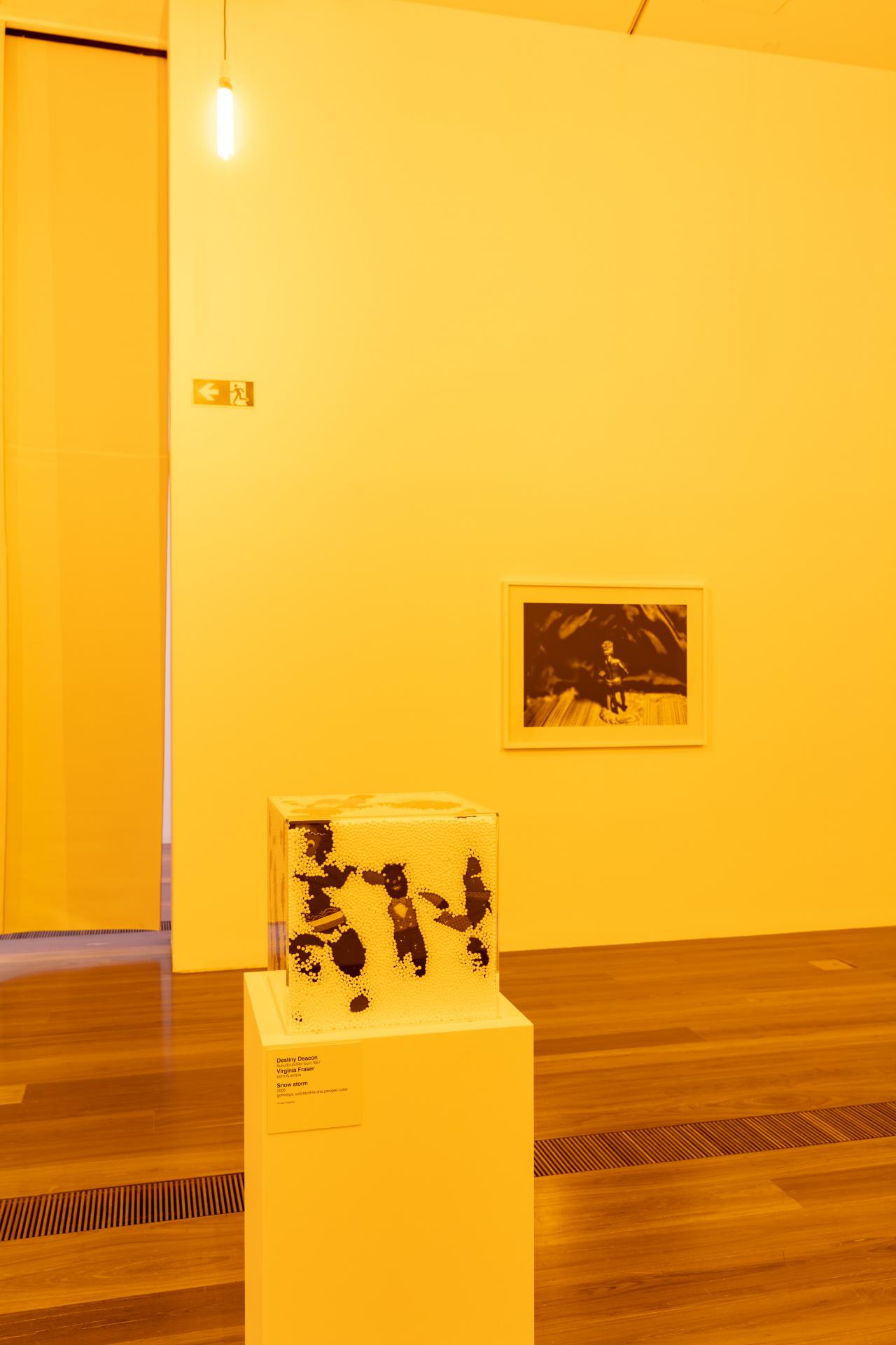 It was Destiny Deacon’s co-collaborator, Virginia Fraser, who first read about this light source in an art magazine whilst transiting through an overseas airport. Fascinated by the unusual effect it apparently had on colour and the subsequent mood it created in a space, Fraser went about trying to source these bulbs. Due to sodium lamps being disposable items and now obsolete technology, not an easy task! However once found, Fraser and Deacon together developed an art installation titled Colour Blinded which utilised their full impact.