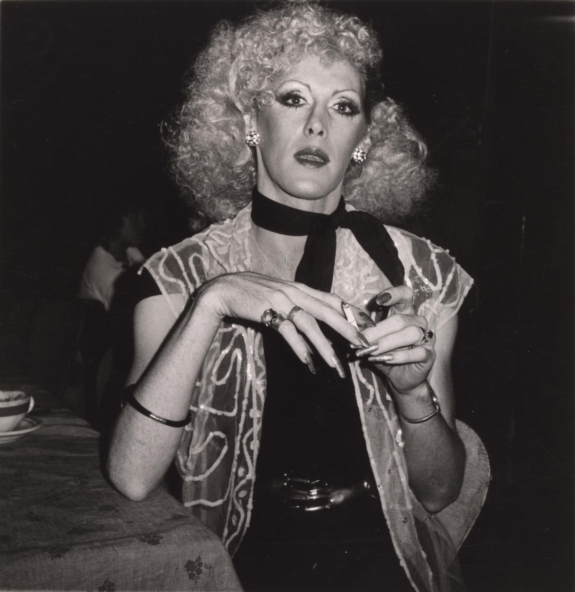 In 1979, one year after the scathing review of Trish’s published in GAY, the late, Melbourne-based social documentary photographer Viva Gibb, who lived in North Melbourne at various times throughout the 1970s and 1980s, visited the coffee shop-cum-drag bar-cum-disco and captured a striking photograph of one of the drag queens – Maxine Du Barry. On a cigarette break between performances, Maxine looks directly into the camera. Wearing a curly blonde wig, a full face of make-up and what appears to be a black bodysuit cinched at the waist with a belt, paired with a necktie and a translucent vest embellished with swirls of sequins, she looks as if she’s stepped straight out of the 1950s. In the same image, Gibb also managed to capture several distinguishing features of Trish’s decor; namely, a coffee cup behind Maxine’s arm, and in the background, a group of patrons sitting in a booth, likely waiting for the next performance.