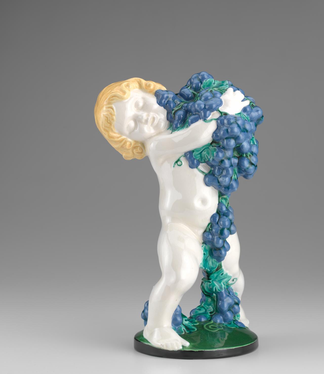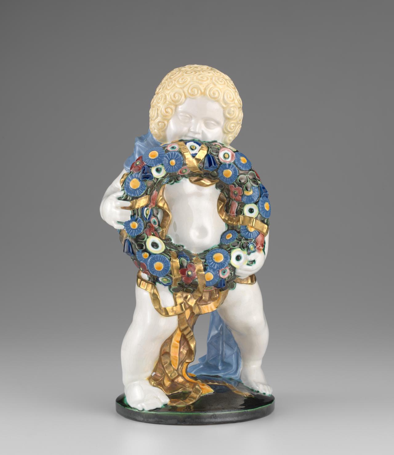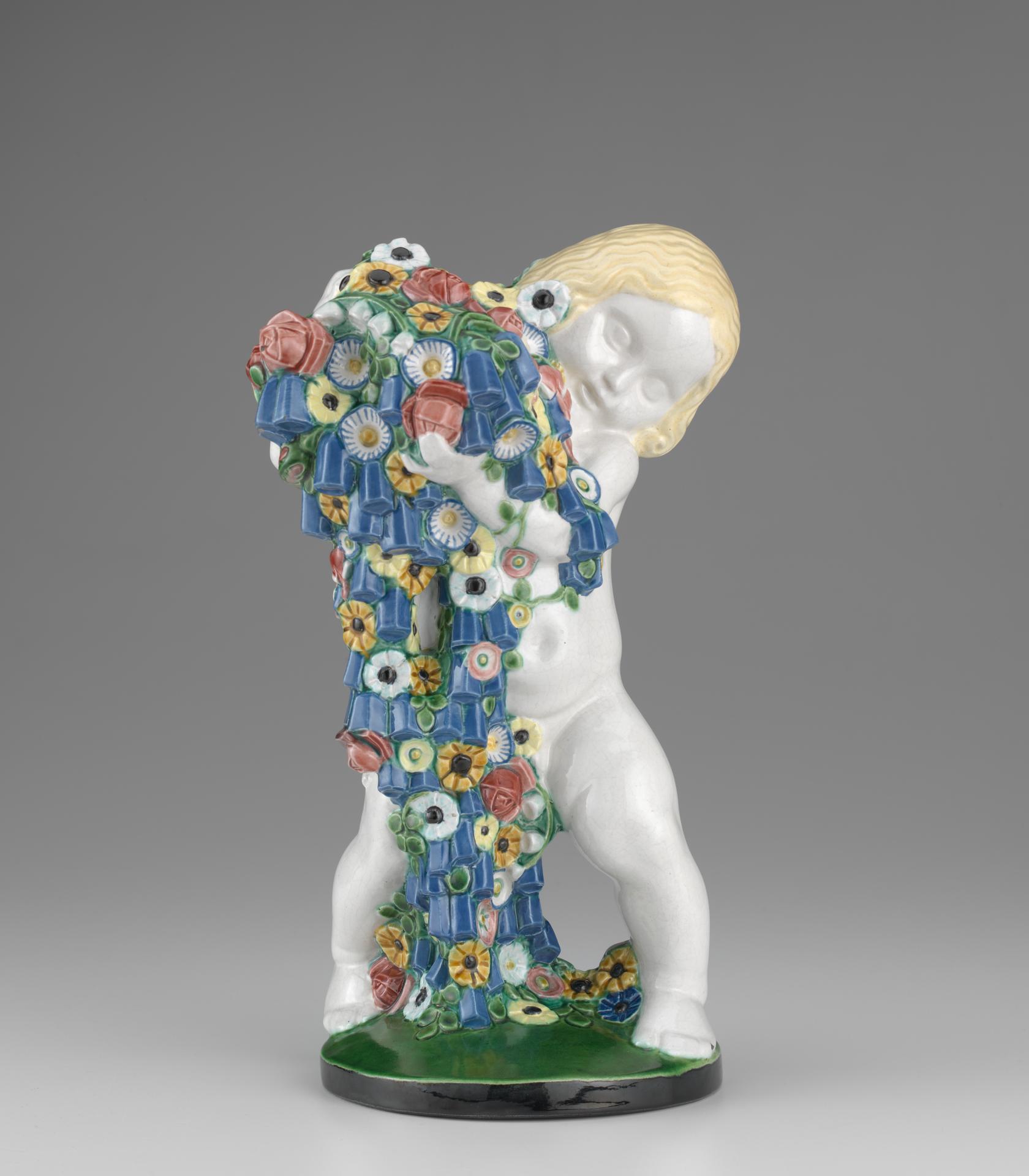 Spring’s sculptural form, vibrant garland and geometric qualities make it a unique example of ceramics from the period. It breaks from what were the broadly conservative tastes of the early 1900s by using simplified, stylised forms, while preserving the Viennese love of decoration and gambolling putti (figures of small children). The son of a potter, Powolny formally trained in ceramics at the Fachschule für Tonindustrie (Institute for Ceramics) in Znaim (now Znojmo) in the Czech Republic, and studied sculpture at the Kunstgewerbeschule (School of Applied Arts) in Vienna, Austria. He then founded the Wiener Keramik studio in 1906, working with the painter and graphic artist Berthold Löffler, a fellow student at the Kunstgewerbeschule.