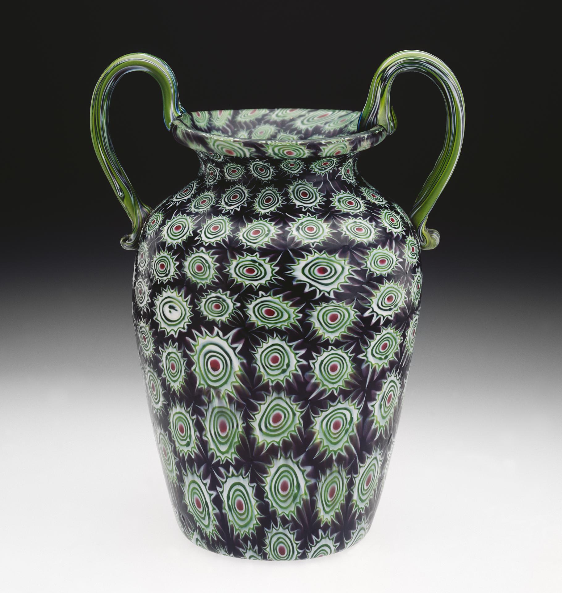 Eastlake also makes reference to ‘millefiori [glass], in which slices of rod-glass [appear] embedded in a colourless or differently-coloured ground of the same material’.33ibid., p. 246. No examples of this kind of glass are to be found in the holdings that the Gallery retains today from its 1880 acquisition. The omission of this important and distinctive type has recently been remedied, however, by the purchase of a handsome two-handled millefiori vase, c.1890–1900, of imposing dimensions (fig. 2). As a modern interpretation of an ancient technique, this work represents an imaginative yet practical improvisation that departs somewhat from the original process, which would have involved the fusing in a kiln of a matrix of small, patterned ‘cane’ slices. The resulting sheet would then have been reintroduced to the kiln and ‘collapsed’ or ‘slumped’ over a mould to create its concavity. There would then have followed the refining and polishing of the form on a lathe. In the case of the Melbourne vase, by contrast, the individual murrine, or mosaic elements, were picked up on the partially inflated bubble of glass known as the paraison, before it was inflated to its final form. The lack of distortion or dilation in the stylised floral motifs in this work is particularly impressive and so is the overall palette, which sets concentric circles of red, white and green murrine against a sombre ground. The vase is similar in appearance to a number of vessels by the firm of Fratelli Toso,34For an illustration of similar vessels in a Fratelli Toso catalogue, see R. Barovier Mentasti, Il vetro veneziano: Dal Medioevo al Novecento, Milan, 1982, p. 237. though the Venice and Murano Glass and Mosaic Company also made millefiori glass of this kind.