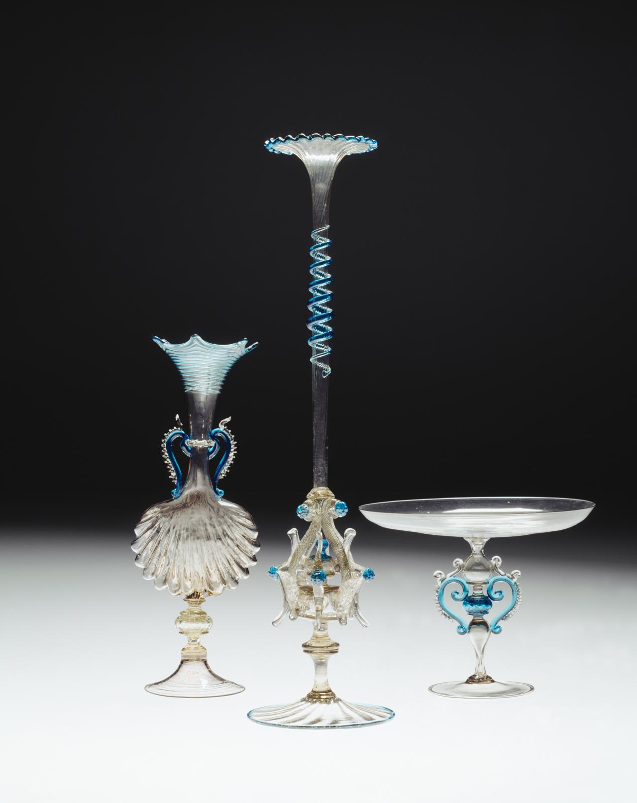 The small ewer or cruet at the left and the covered sweetmeat dish with vetro a fili decoration replicate well-known seventeenth-century models. A similar nineteenth-century cruet and covered sweetmeat dish are in the Robert Lehman Collection at the Metropolitan Museum of Art, New York. Comparable covered sweetmeat dishes are also in the Corning Museum of Glass and the Museo Vetrario di Murano.