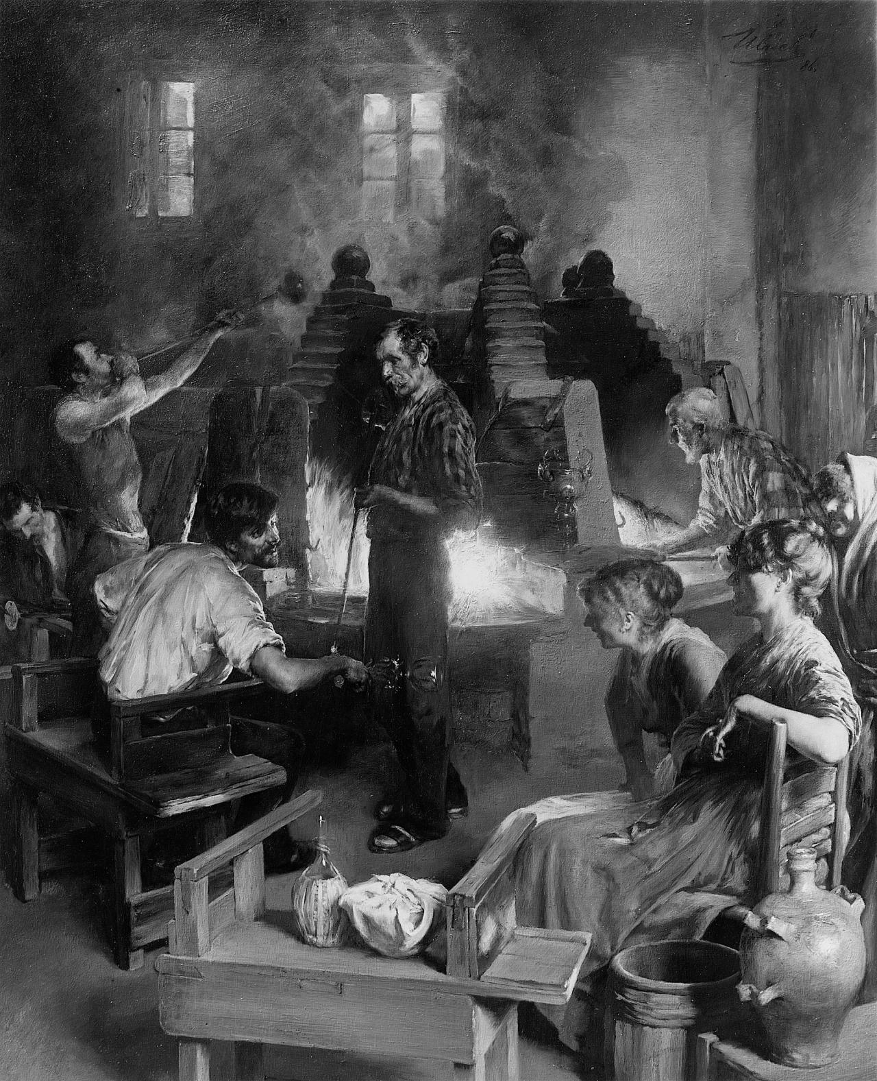 In Ulrich’s painting, now at the Metropolitan Museum of Art, New York, we see the operation of a typical glasshouse, similar no doubt to that responsible for the curvilinear elegancies that travelled so boldly to Melbourne in 1880. In the foreground a debonair young maestro sits at a distinctive glassmaker’s chair, across whose elongated arms the craftsman rolls a metal rod supporting a near-complete goblet. To the left, another man puffs into a blowpipe to inflate a vessel. Only a few shafts of sunlight creep into the sooty, roaring interior. We notice also the unexpected presence of two young women, who momentarily distract the young gaffer from his immediate task. Very possibly, a bravura display of glassworking skill is imminent.