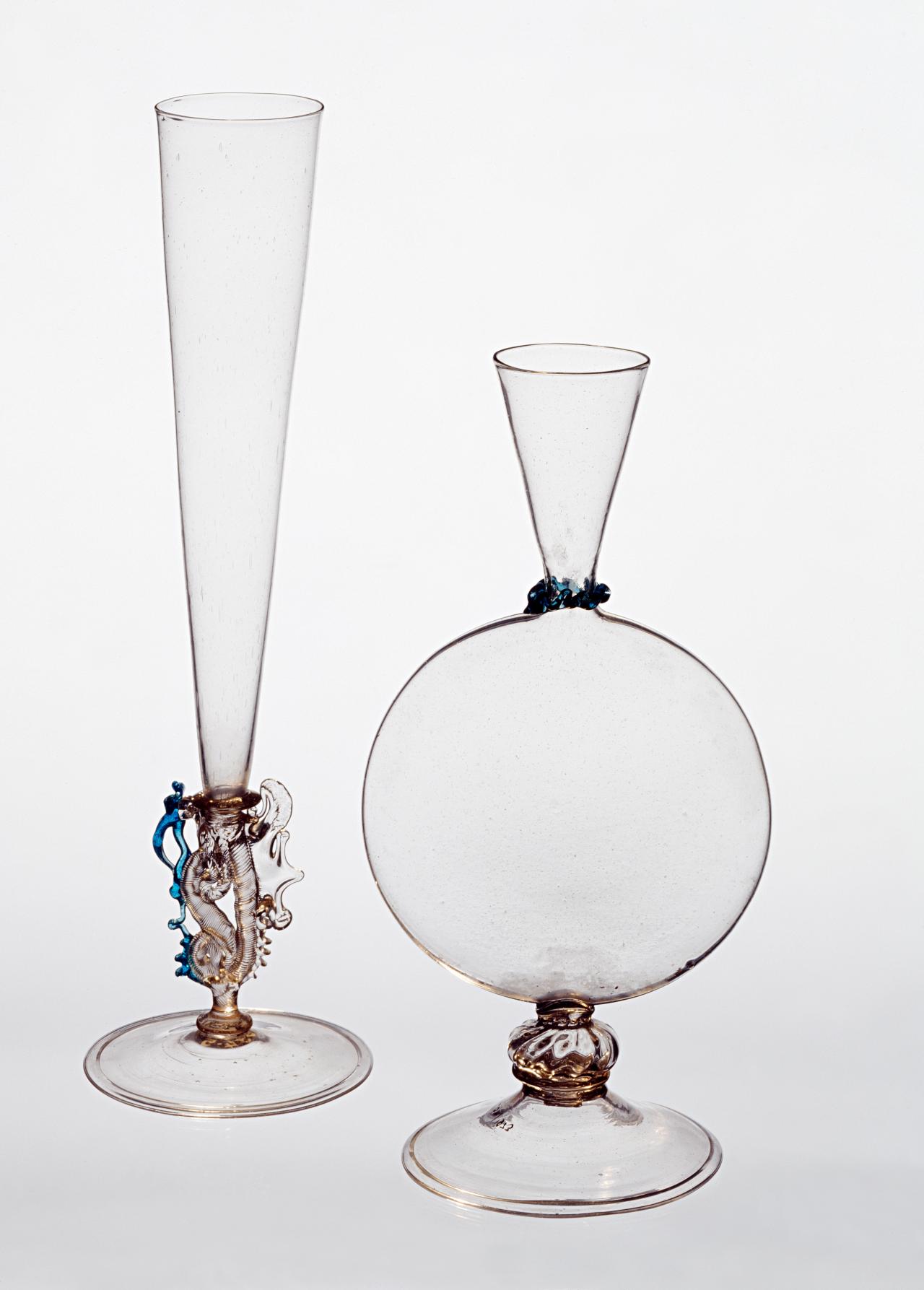 Both of these forms are typical of the early Venetian and façon de Venise glass that served as models for glassmakers in the nineteenth century. Comparable examples to the flat-bodied vase/flask are in the Museo Vetrario di Murano; the Kunstsammlungen der Veste Coburg; and the Robert Lehman Collection at the Metropolitan Museum of Art, New York.