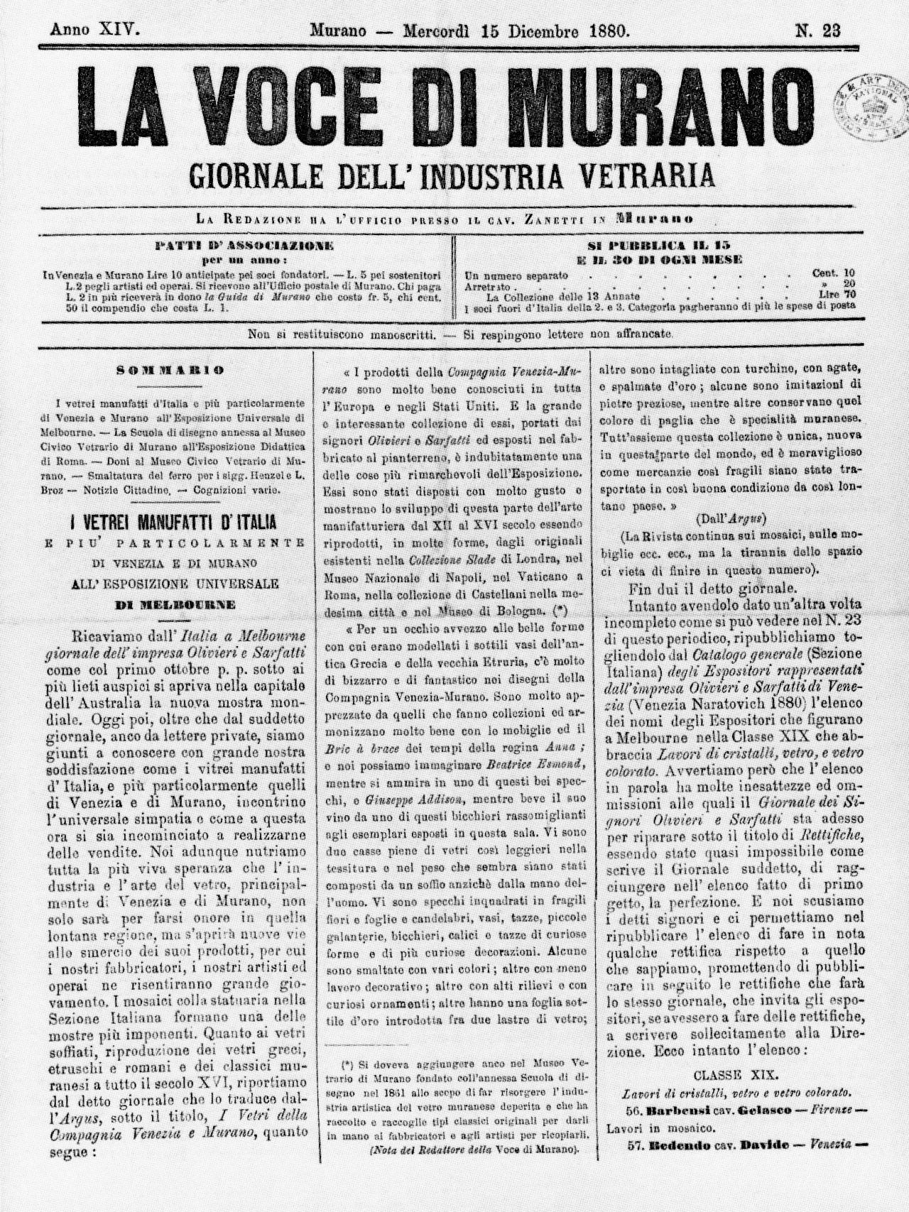 16 ‘I vetrei manufatti d’Italia e piu’ particolarmente di Venezia e di Murano all’Esposizione Universale di Melbourne’, La Voce di Murano, 15 December 1880, p. 89.
