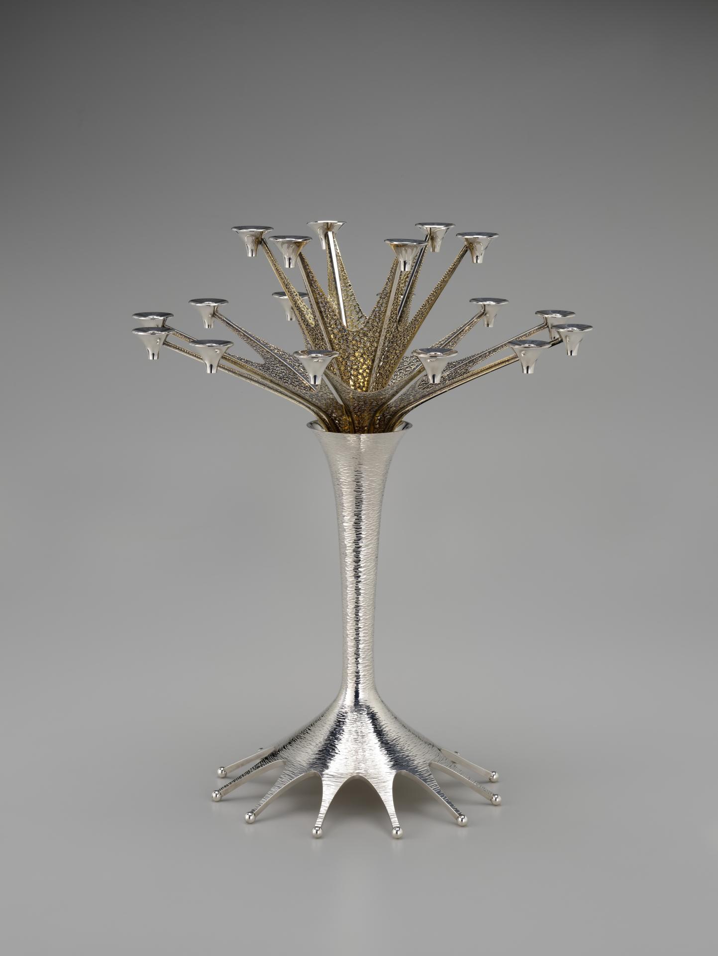Eighteen light candelabra, 1975, is an outstanding example of Stuart Devlin’s larger-scale silverware centrepieces, which resolvedly reflect his sculptural inclinations and innovative filagree work, intended to surprise and delight the viewer. A gift of Krystyna Campbell-Pretty AM and Family, the candelabra introduces a cornerstone of Devlin’s workshop’s expansive range that was not represented in the NGV Collection, sitting alongside his hollowware (vessels such as goblets and wine coolers), ceremonial objects such as his renowned Surprise eggs, 1973–74, tableware and jewellery.