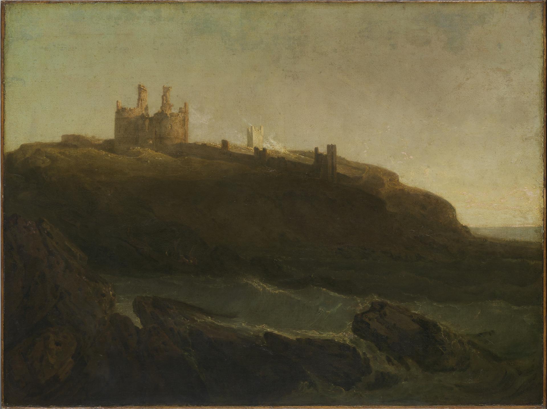 It was a revelation, in 2014, watching then NGV Senior Conservator of Painting John Payne carefully remove discoloured varnish and grime from the surface of J. M. W. Turner’s early masterpiece, Dunstanburgh Castle, north-east coast of Northumberland, sunrise after a squally night, 1798. Suddenly, at the centre of the painting, tiny figures of fishermen could be seen wrestling with a boat at the edge of a rock-strewn inlet. To the far right, minute specks of coloured paint hinted at other figures gathered at the water’s edge on the coast beneath the imposing ruins of the medieval castle of Dunstanburgh (or Dunstanborough), that has stood sentinel on the north-east coast of England since the fourteenth century. These humanising touches play a vital role in Turner’s dramatic depiction of the castle’s sunlit gatehouse and towers, which rise majestically above the besieging forces of wind and sea. They provide a sense of scale to Turner’s composition, their diminutive presence enhancing the sublime and awesome effect of Dunstanburgh’s ancient, monumental ruins.