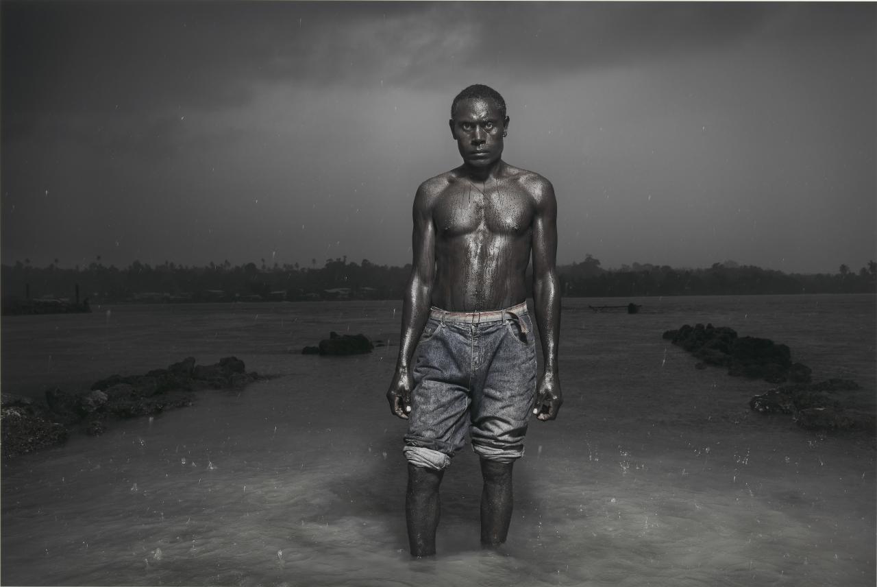 Gori standing in a Buka passage, 2009–10, shows a young man standing in front of a narrow strait, less than a kilometre wide, which separates the Island of Buka from the northern part of Bougainville. Gori gazes directly into the camera as if to ask what happened, or to say, ‘I know what happened but I don’t understand why’. This is a common feeling among the blood generation, the silent victims of the Bougainville war, who were far too young to comprehend its inexorable repercussions.