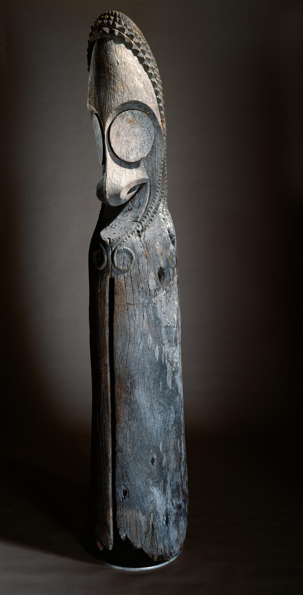 The drum has a hermaphroditic quality, combining symbolic aspects of both male erection and female genitalia. Its soaring form is human, ephemeral and aspiring. The head, like that of graded-society, tree-fern sculpture, is dominated by a strongly aquiline nose and huge round eyes which give an impression of great serenity and composure. The rounded head with large crest serves to distinguish Ambrym slit-drums from those produced on Malekula Island, which are carved with a truncated top and squat, stylised face in low relief.