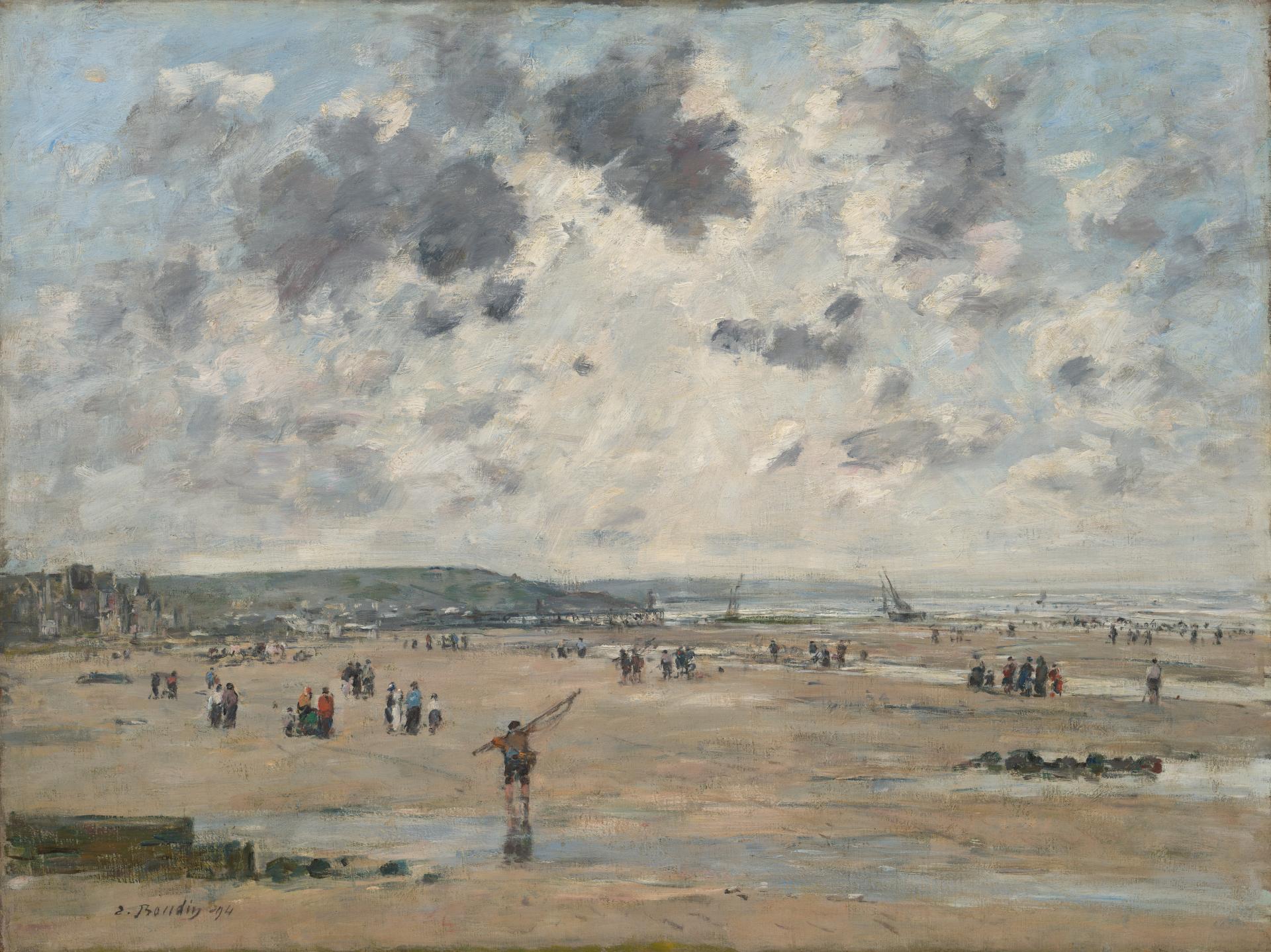 Boudin grew up with the ocean at the forefront of his existence. The son of a ship’s captain, he worked as a cabin boy at the age of ten on his father’s ferryboat, as it traversed the waters between Honfleur and Le Havre.3The National Gallery, ‘Eugène Boudin’, The National Gallery, <https://www.nationalgallery.org.uk/artists/eugene-boudin>, date accessed 30 Nov. 2023. While his family soon retired to the town of Le Havre to manage a framing business, Boudin’s journeys to sea would continue, now through the medium of paint. Boudin first exhibited at the Salon in 1858 with The Pardon of Saint-Anne-La-Palud (The Met, New York City). Beginning in 1667, the Salon was the official art exhibition of the Académie des Beaux-Arts in Paris. Between 1748 and 1890 it was arguably the greatest annual or biennial art event in the Western world. While The Pardon of Saint-Anne-La-Palud was the depiction of a religious festival, Boudin’s affinity with the ocean led to the beachscapes that exemplify his style from the 1860s onwards. Mainly painted at the Norman resort towns of Deauville and Trouville, the horizontal format of these works show an expansive sky and low shoreline, influenced by the composition of Dutch landscape artists.4 Julia Welch, ‘Boudin, Mentor to Monet’, in French Impressionism from the Museum of Fine Arts, Boston, National Gallery of Victoria, Melbourne, p. 43.