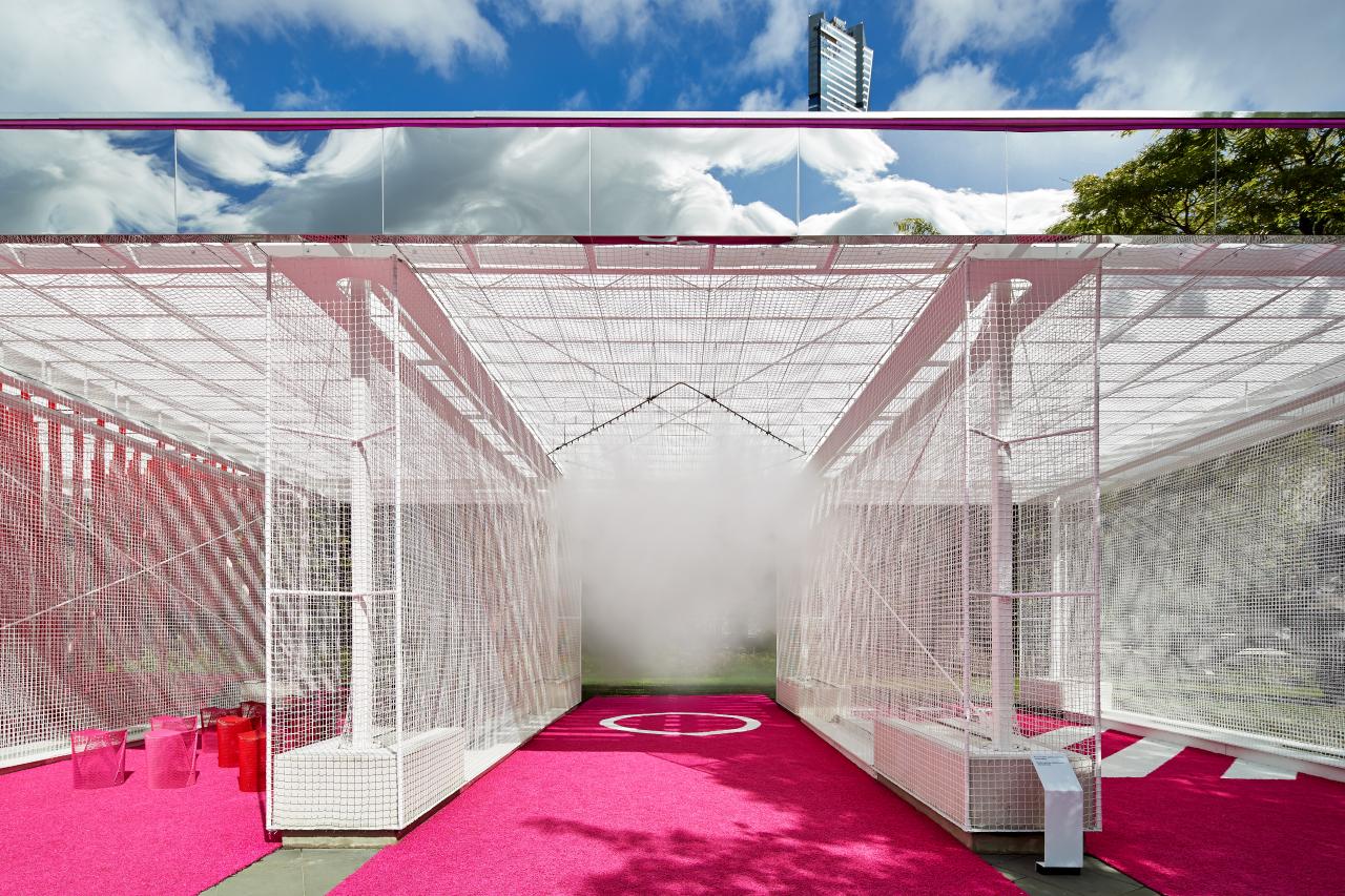 In the pavilion, a saturation of disparate conditions can coexist, offering a curious state that does not quite make sense. It asks ‘what if?’. What if the scale of the suburbs landed in the NGV Garden? What if architecture could dematerialise? What might an uncertain condition look and feel like? What joy can we take in an abundance of overlaid grids, cricket nets, mist, porosity and ghostly visual effects? What if the road came to life with vivid pink astroturf? What if you were immersed in a grotto-like field of translucent red? What if architecture shivered ever so slightly in the wind?