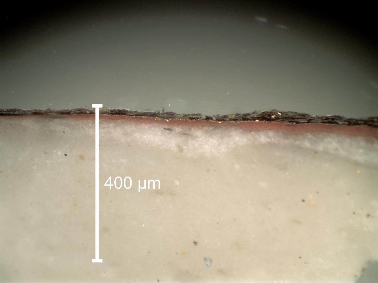 Cross-section of the gilded surface viewed under microscope where 400um = 0.4mm. The gold leaf is visible as an unbroken gold line above the pink foundation (bole) with the platelets of oxidised bronze paint sitting stacked on the gold leaf.