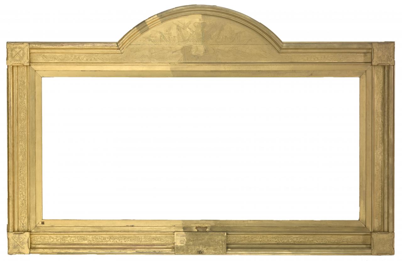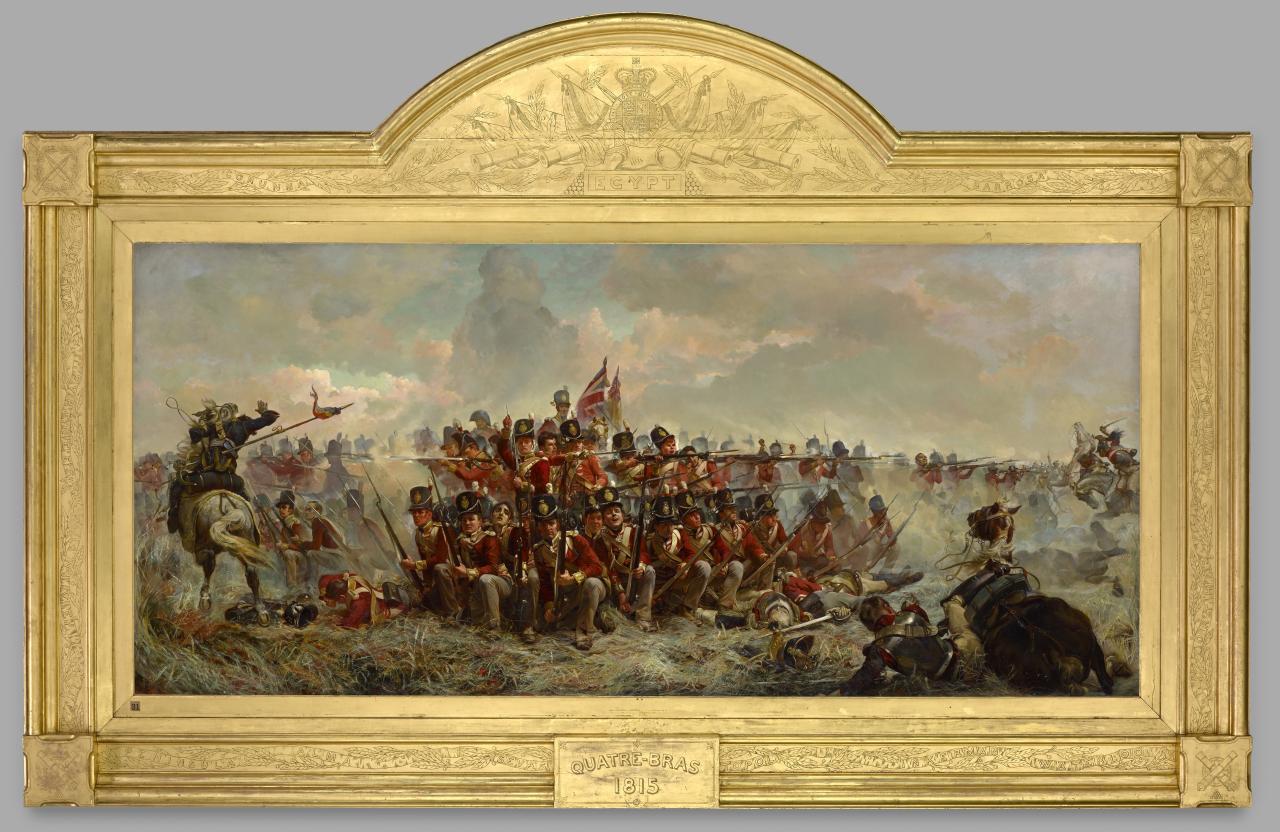 The commanding gilded frame surrounding Elizabeth Thompson’s The 28th Regiment at Quatre Bras (1875) is a simplified trophy frame. This style of frame uses motifs and symbols relevant to the painting it houses to tie the painting to a particular myth, event or family or, as is the case here, military engagements of the 28th (North Gloucestershire) Regiment of Foot. The frame is likely contemporary to the painting dated 1875 and was perhaps even designed by the artist herself when the painting was commissioned by Charles Galloway.