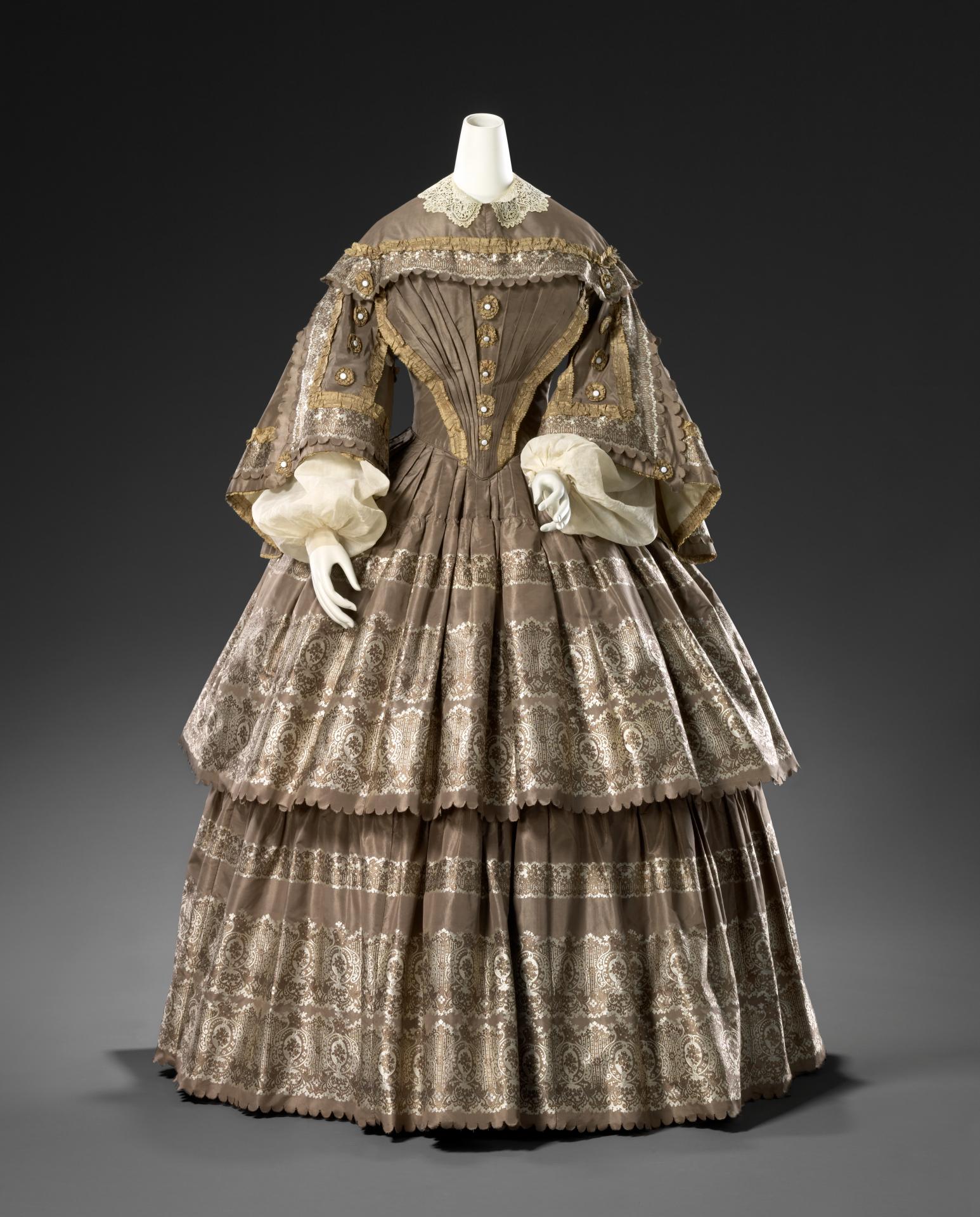 The collection is predominantly of costumes, but there is a small selection of men’s hats, capes and waistcoats. The most spectacular and important part of the collection is comprised of some two hundred gowns, dresses and cloaks of superb quality which are supplemented by capes, shawls, hats, bonnets, gloves, muffs, fans, parasols, bags, stockings, shoes, jewellery, powder-and-cigarette boxes, ribbons, feathers, night dresses, boudoir caps, camisoles, combinations, drawers, petticoats, corsets, bustles and crinolines. Also important is a section devoted to rare children’s costumes, dresses, coats, caps, hats, shoes, babies’ robes and bonnets. The material in this section dates from 1845 to 1930. The earliest dress in the collection is an open robe of Spitalfields silk, of 1765, of sage green brocade with a pattern of meandering garlands of flowers in pink and ivory.