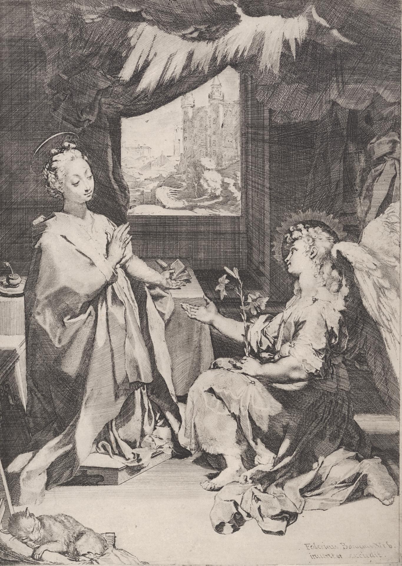 L’Annunciazione fu l’ultima incisione di Barocci, nonché il suo più grande successo come incisore. L’opera riproduce il suo dipinto del 1582-84 (esposto alla Pinacoteca Vaticana), che raffigura il momento, descritto nel Vangelo di Luca, in cui l’arcangelo Gabriele rivelò alla Vergine Maria che avrebbe dato alla luce il Figlio di Dio. Barocci ambienta la scena sacra in una camera domestica dove dettagli naturalistici, come il gatto che dorme e la vista della natia Urbino che si intravede dalla finestra, fanno da contraltare all’incontro miracoloso. Il mistero divino del momento è trasmesso dall’esplosione di luce che illumina la camera buia e avvolge le figure in un bagliore radioso.