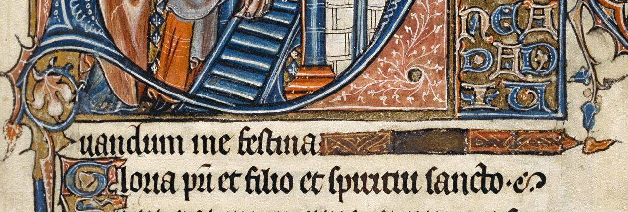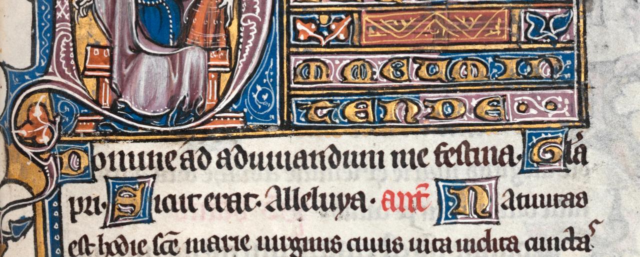 The script of the Hours is in a well-formed liturgical gothic hand, though uneven at times and not free from errors. It is the same as that used for the Psalter section, but, in keeping with the established tradition for the transcription of breviary Offices, two sizes of script are used in the Hours to denote the differences between the main text and the antiphons, verses and responsories etc. Despite this manuscript’s abundance of historiated and decorated initials and exuberant borders, it is the script that predominates. Written in a strong brownish-black ink, no doubt of iron gall composition, and with only slight tonal variations, it is the core around which colour, decoration and figuration are developed, revealing the close links between scribe and illuminator.