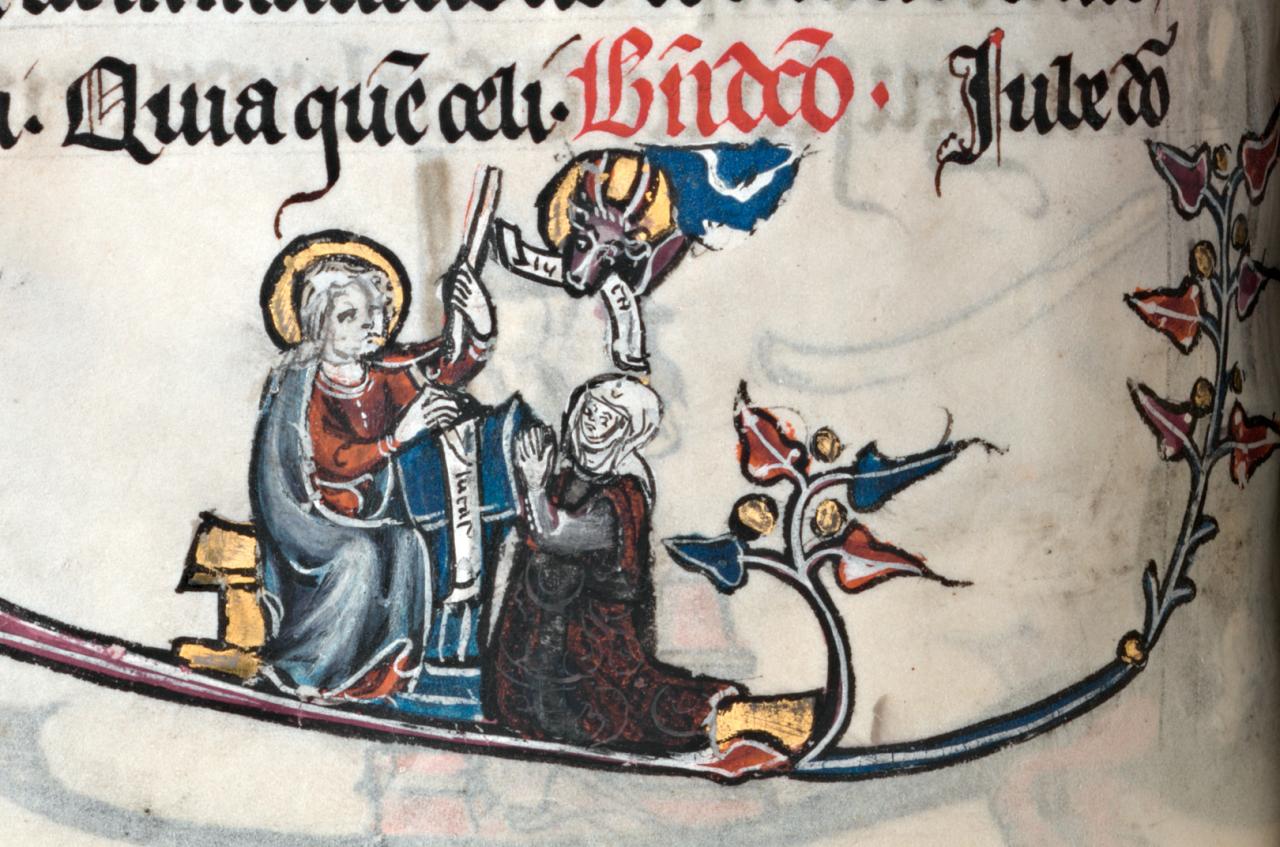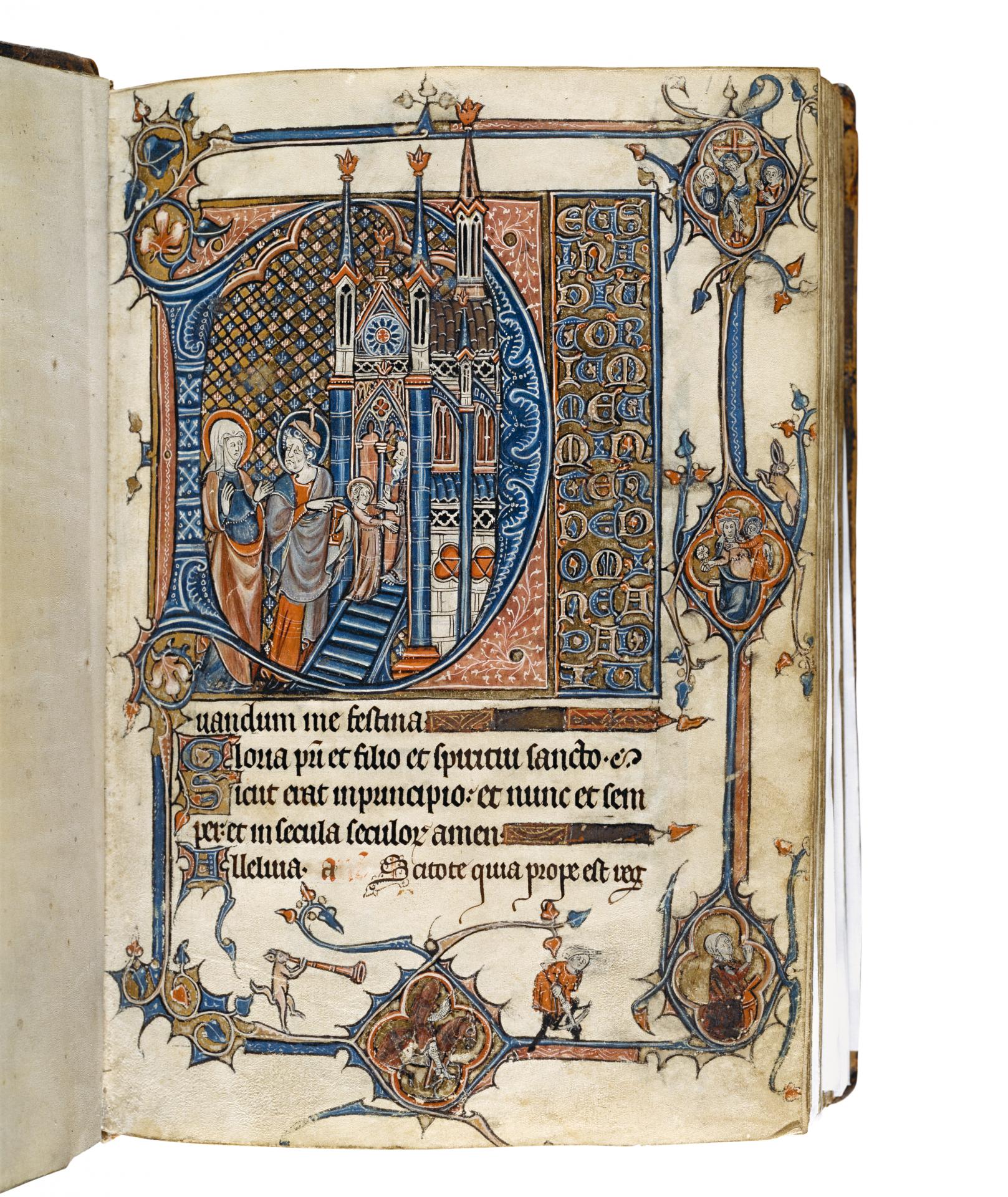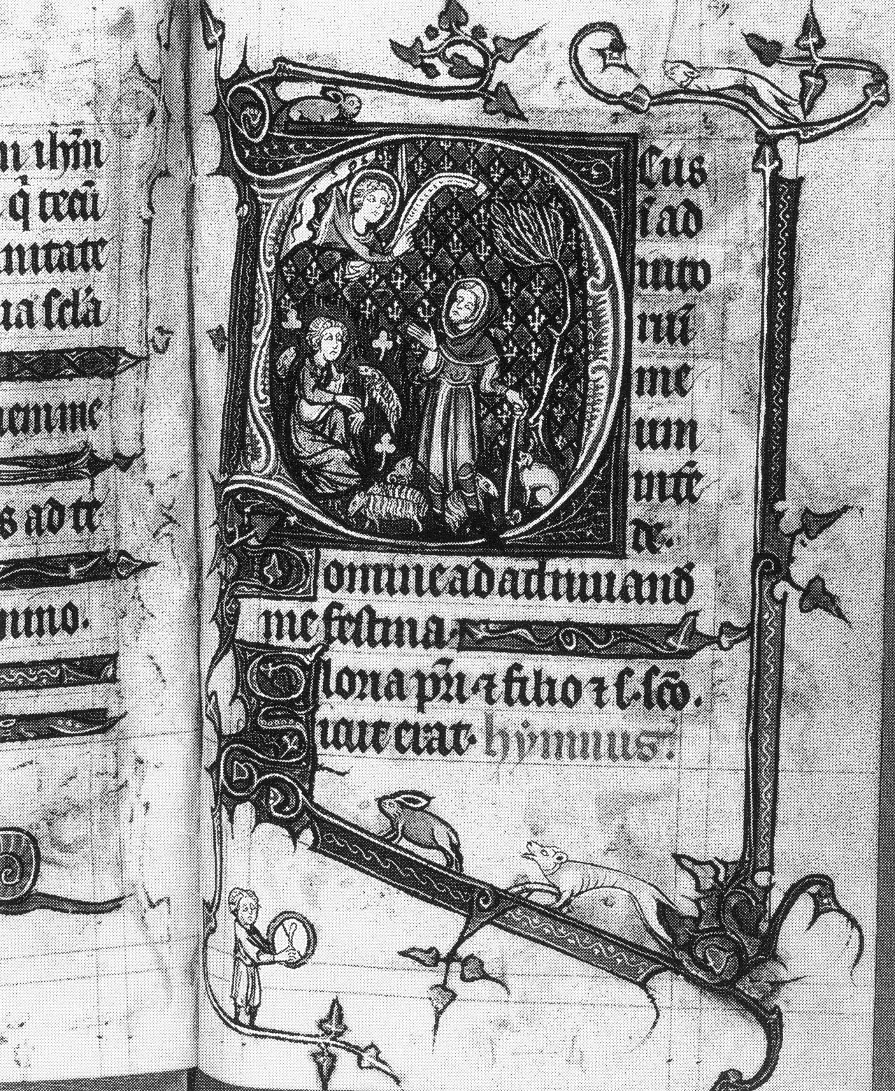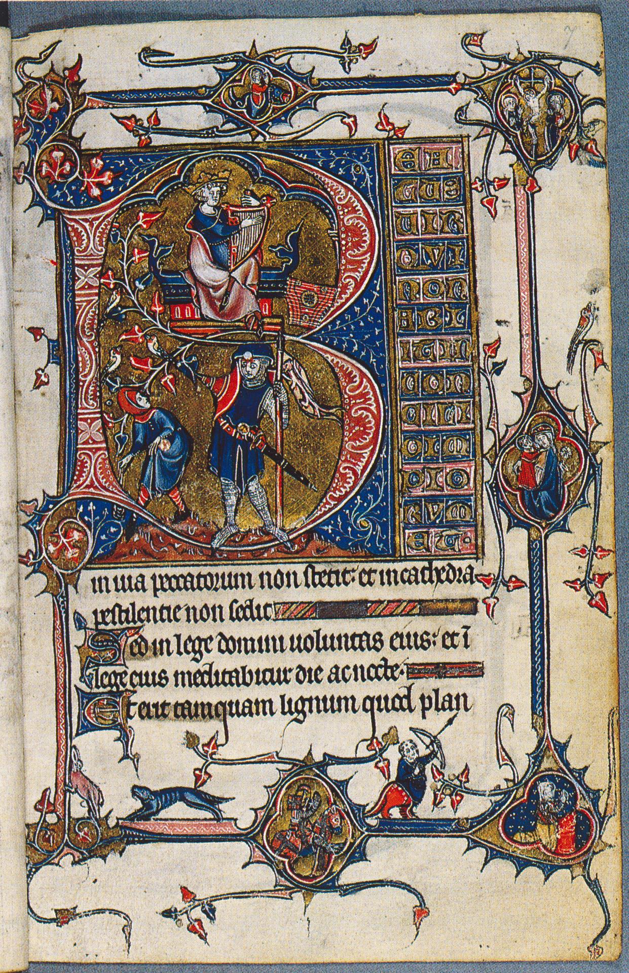 By this time the psalter had long been used for personal prayer by both clergy and laity, but during the second half of the thirteenth century there developed, especially in England, France and the Netherlands, a new type of devotional manual: the Book of Hours.10For the Book of Hours, see V. Leroquais, Les Livres d’heures manuscrits de la Bibliothèque Nationale, 3 vols, Paris, 1927; J. Harthan, Books of Hours, London, 1977; R. S. Wieck, L. R. Poos, V. Reinburg & J. Plummer, Time Sanctified, New York, 1988. This consisted of various supplements to the Divine Office, or official liturgical prayer of the Church; most notable of these was the Little Office, or ‘Hours of the Virgin’, which was modelled on the longer breviary Office and was to become very popular with the laity. In the thirteenth and fourteenth centuries these supplementary texts were often attached to a psalter, hence the term Psalter-Hours. An early characteristic of the decoration of such books was the marking of each section by historiated initials or miniatures, whose compositions and images were an integral part of the book’s devotional content. In particular, the canonical Hours of prayer in the Little Office of the Virgin were regularly accompanied by a series of illustrations drawn from the life of Christ and the Virgin or from the Passion, and in some cases from both.11See Harthan, pp. 26–9.